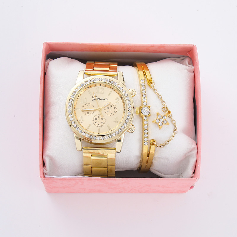 geneva跨境爆款手表套装 时尚女士小众百搭假三眼钢带石英腕表