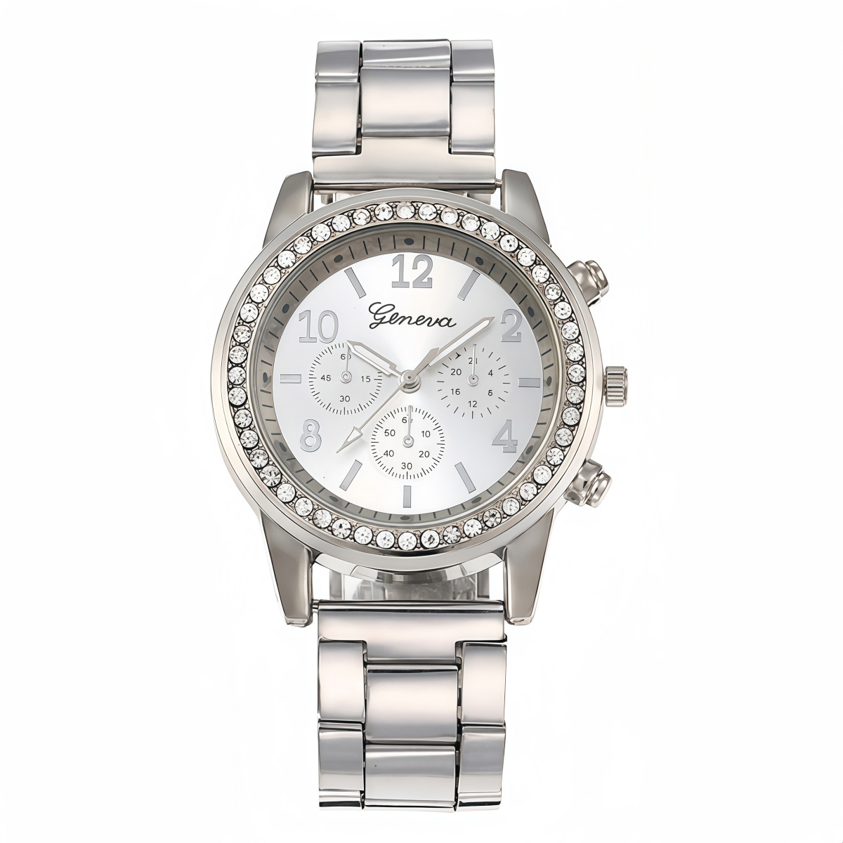 人気のジュネーブ偽三眼時計、ファッショナブルなダイヤモンド付きスチールバンド腕時計、女性用ジュネーブクォーツ装飾時計セット