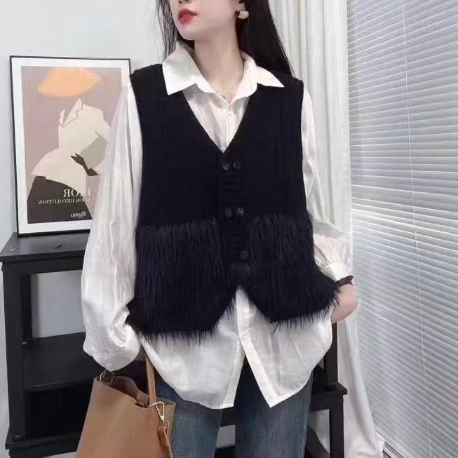 气质优雅小香风V领背心双排扣仿貂绒流苏拼接时尚外搭针织马甲女
