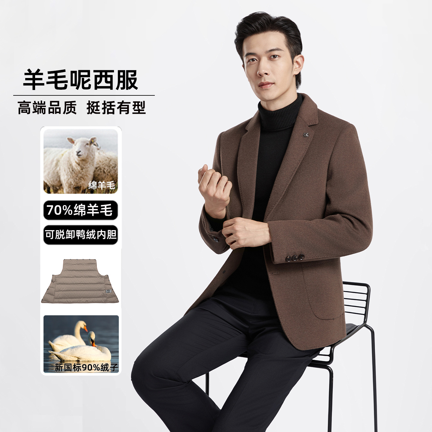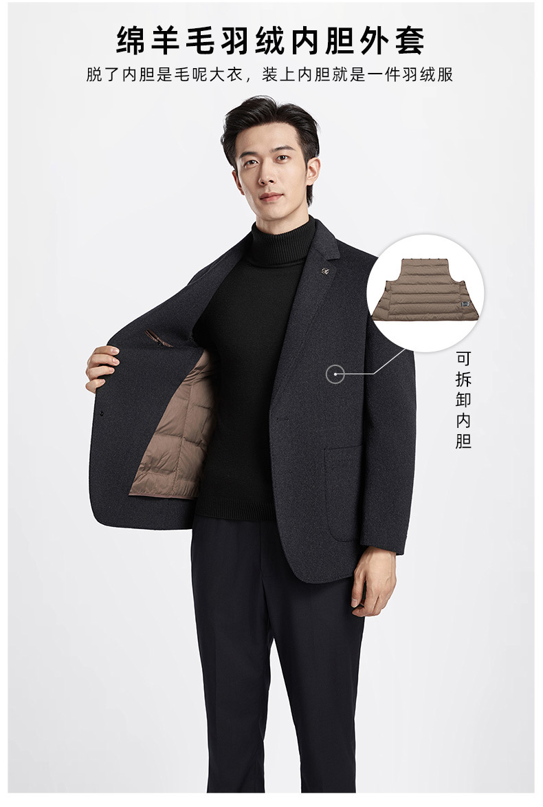 男士全羊毛双面呢西装秋冬新款可脱卸鸭绒内胆商务休闲西服外套