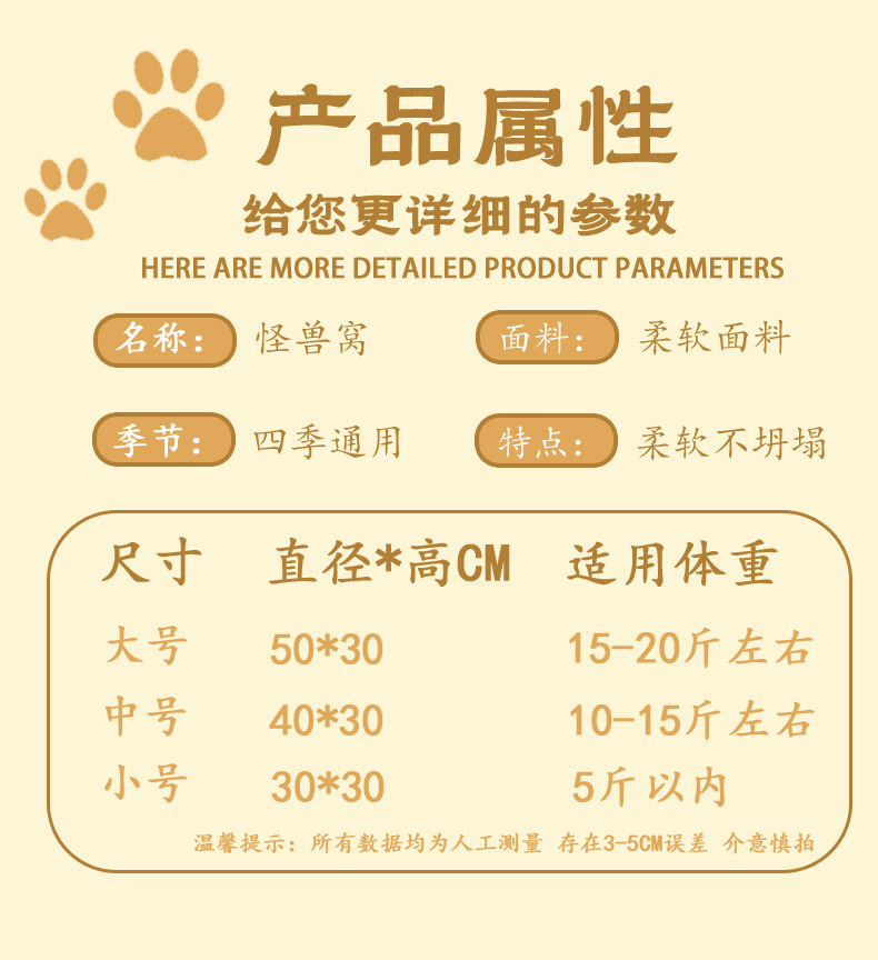 颜色 怪兽窝小号:30*30【5斤以内】,怪兽窝中号:40*30【10-15斤左右】,怪兽窝大号:50*30【15-20斤左右】