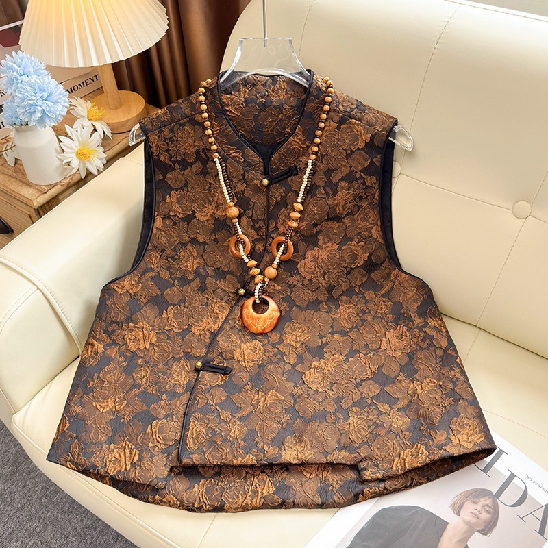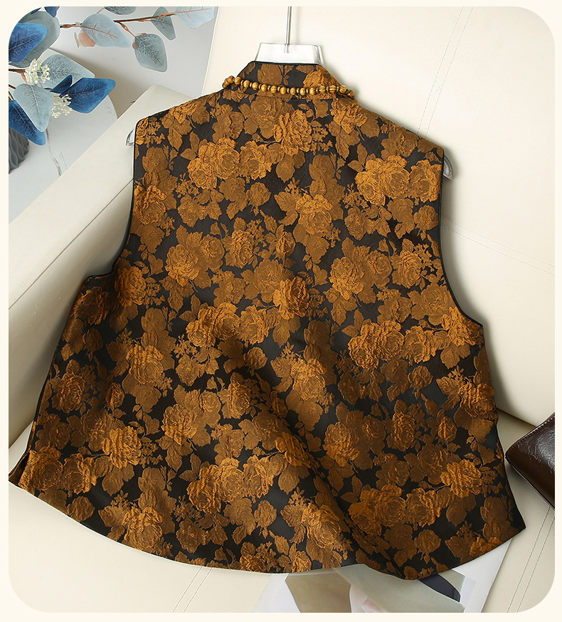 复古新中式立领盘扣马甲2025秋季时尚咖色花卉提花无袖背心上衣女