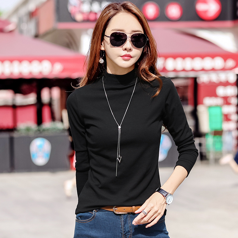 218秋冬レディース大きいサイズ半高襟インナーシャツ綿厚手韓国風長袖Tシャツ韓国風スリムフィット