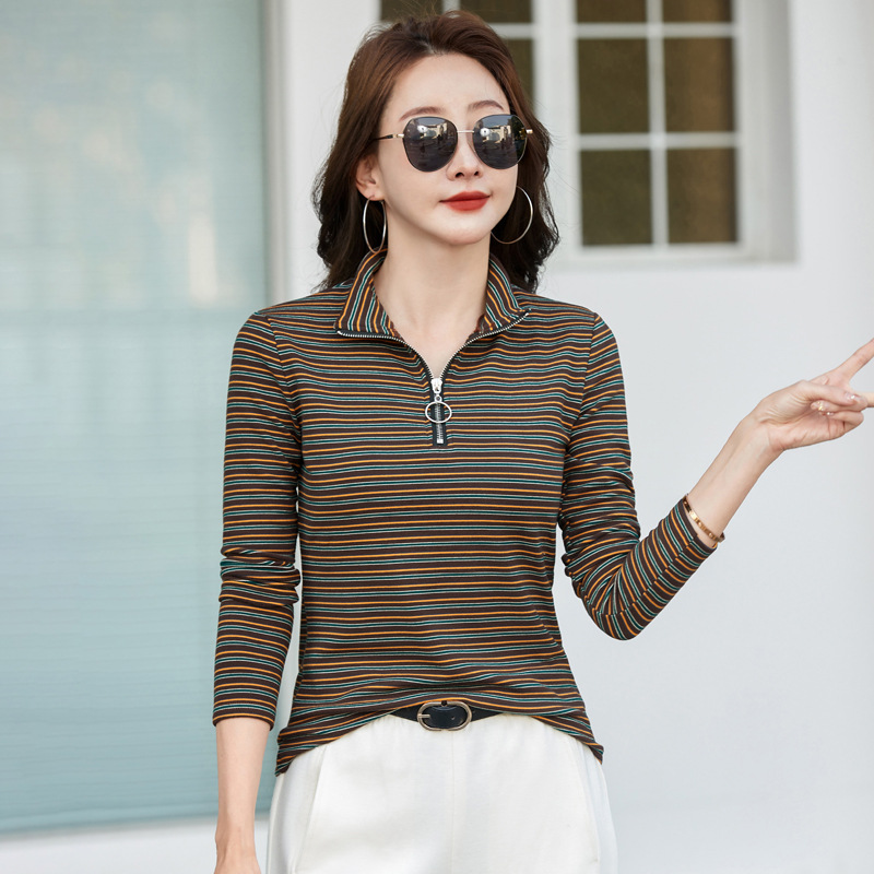 551 半高领条纹打底衫秋冬新款拉链时尚长袖女装上衣显瘦减龄百搭
