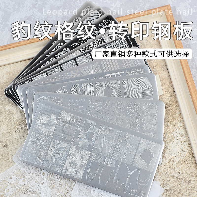 跨境美甲印花板格纹豹纹牛仔纹 Nailplate不锈钢指甲模板转印批发