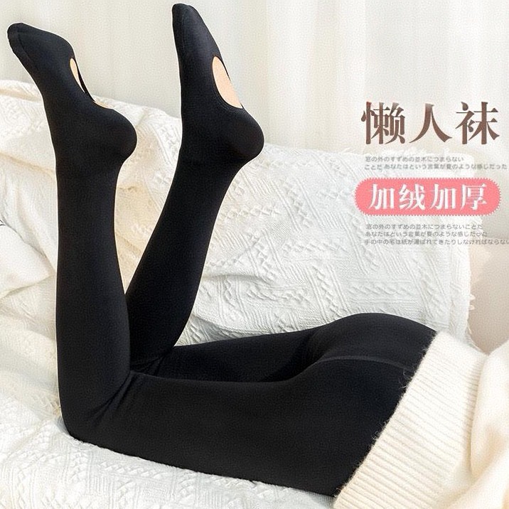 秋冬加厚加大码薄绒女光面黑肤脚底挖洞免脱懒人打底袜子肤色保暖