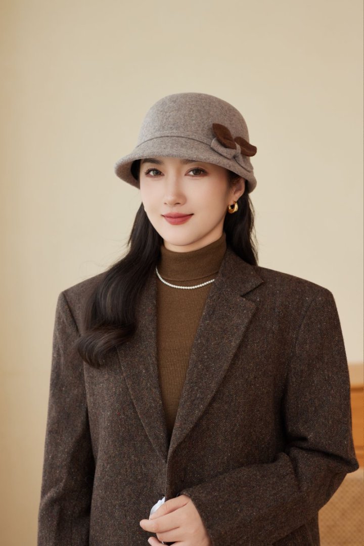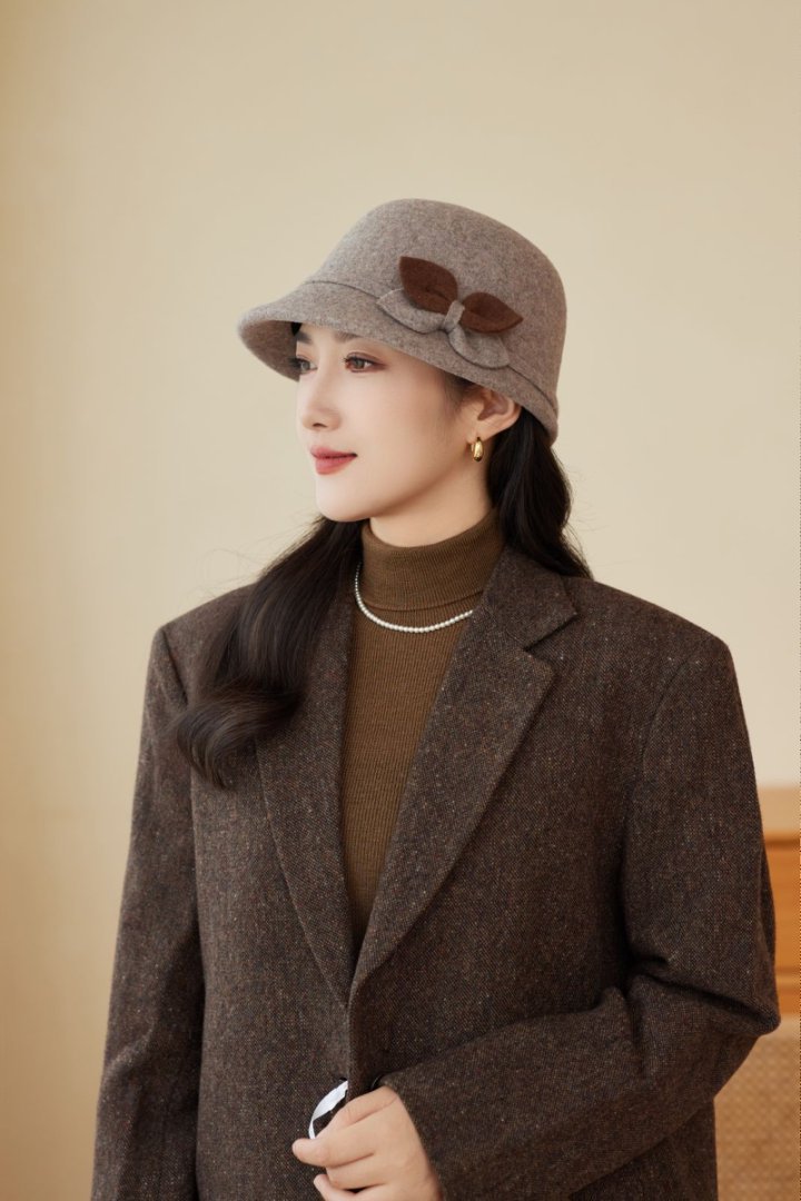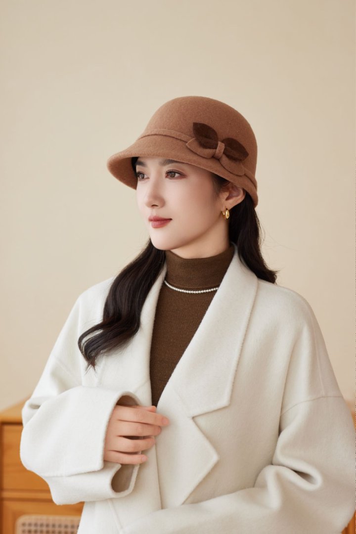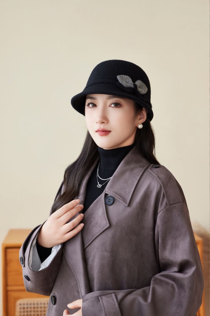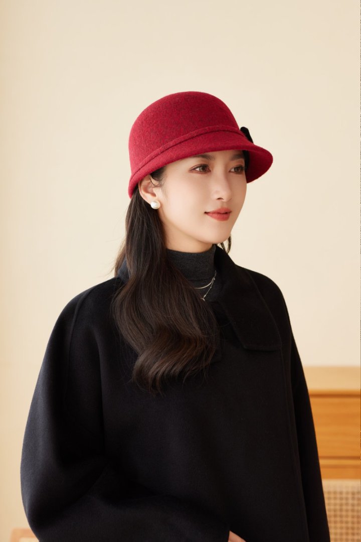 秋冬季显脸小盆帽复古赫本风蝴蝶结渔夫帽女士优雅羊毛呢时装盆帽