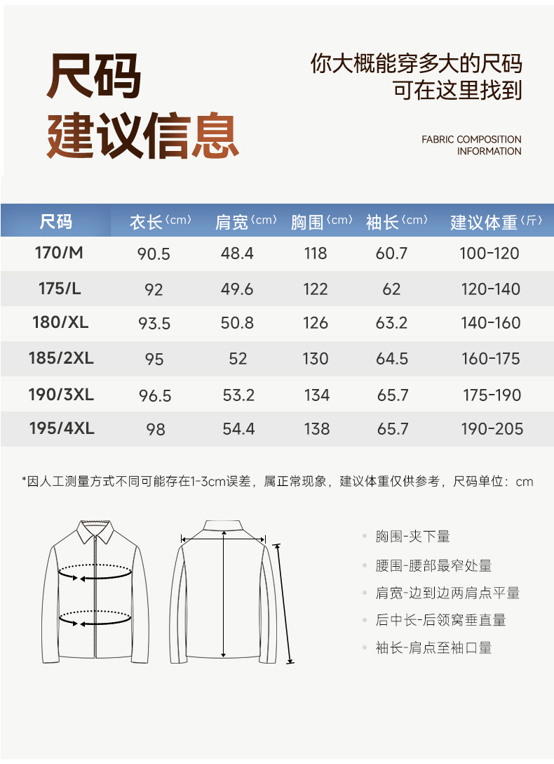 48/170/M 适合90-120斤,50/175/L 适合120-135斤,52/180/XL适合135-150斤,54/185/XXL 适合150-165斤,56/190/XXXL适合165-180斤,58/195/4XL适合180-200斤