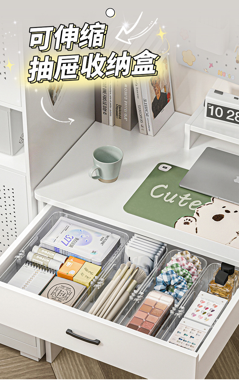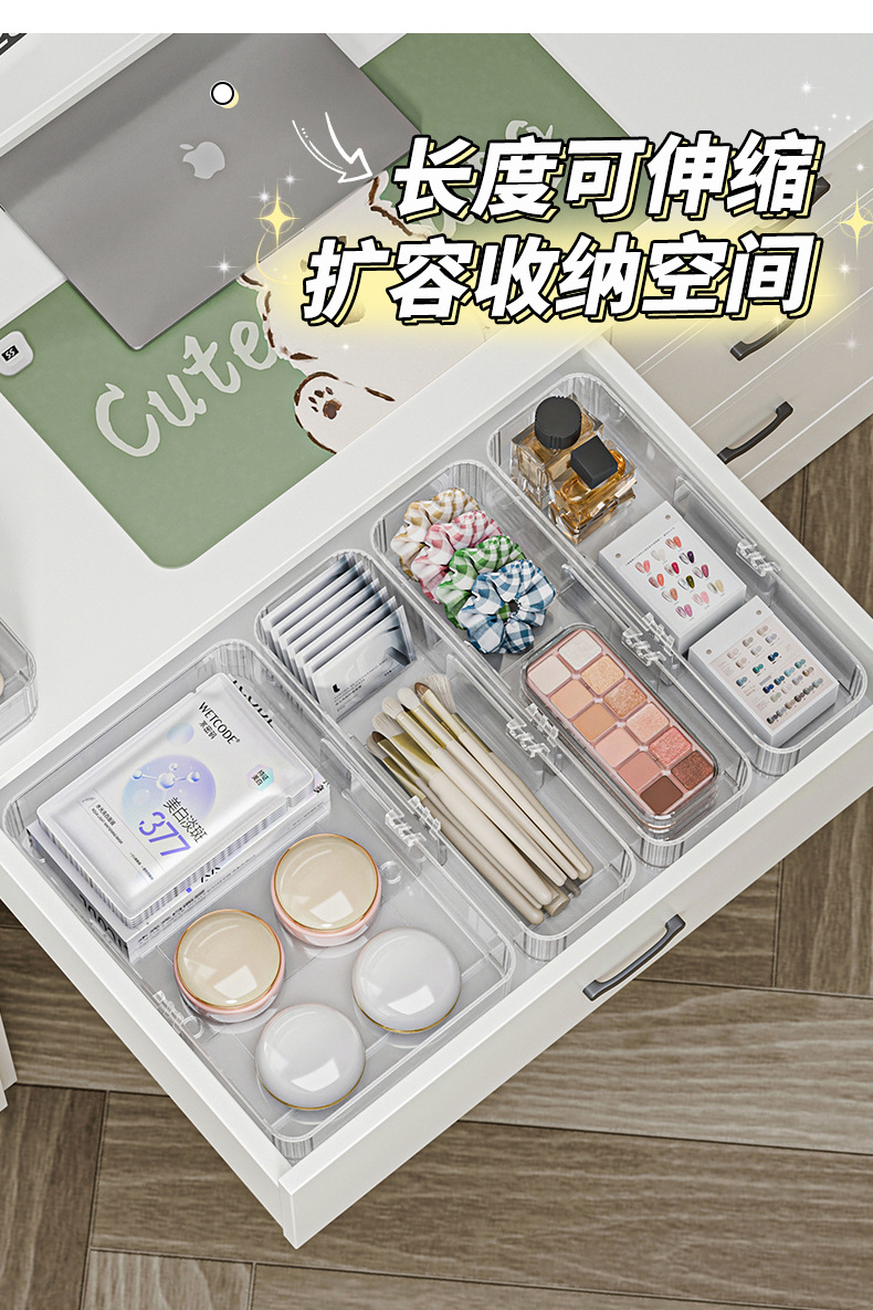 可伸缩抽屉收纳盒内置分隔化妆品口红整理盒桌面梳妆台透明储物盒