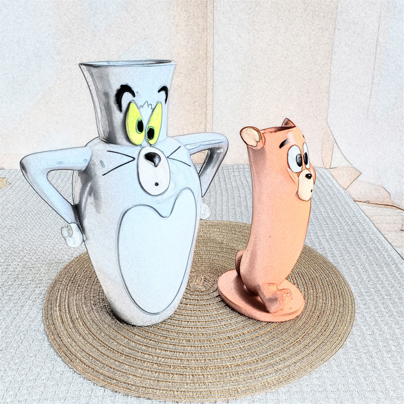 漫画風変形ネズミ花瓶、フラワーアレンジメント、ドライフラワー装飾、トムとジェリー花瓶、猫とネズミの花瓶、樹脂製置物