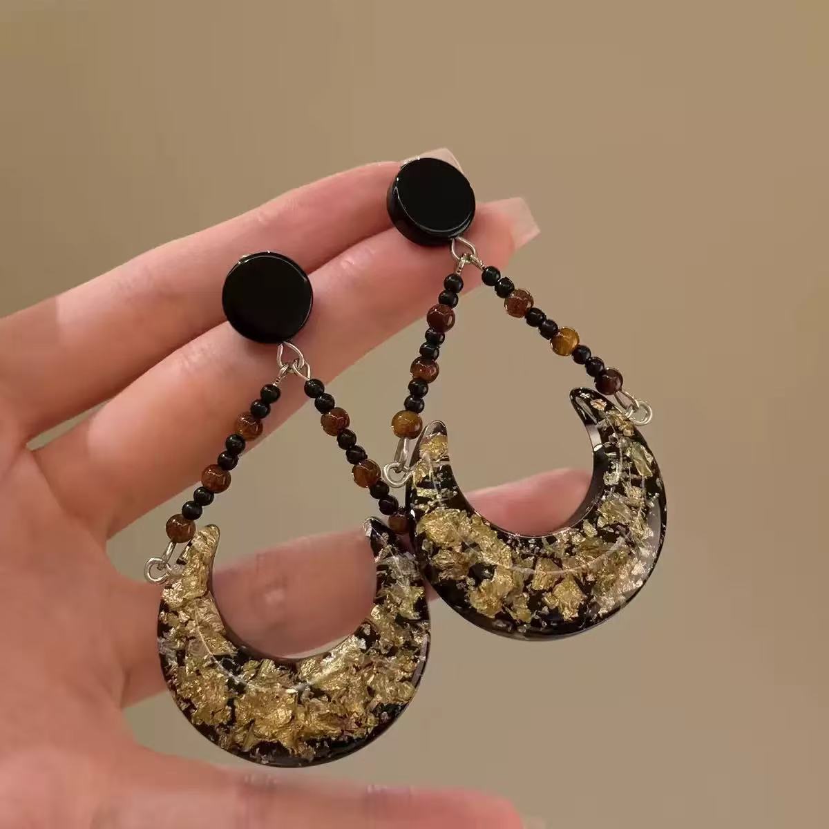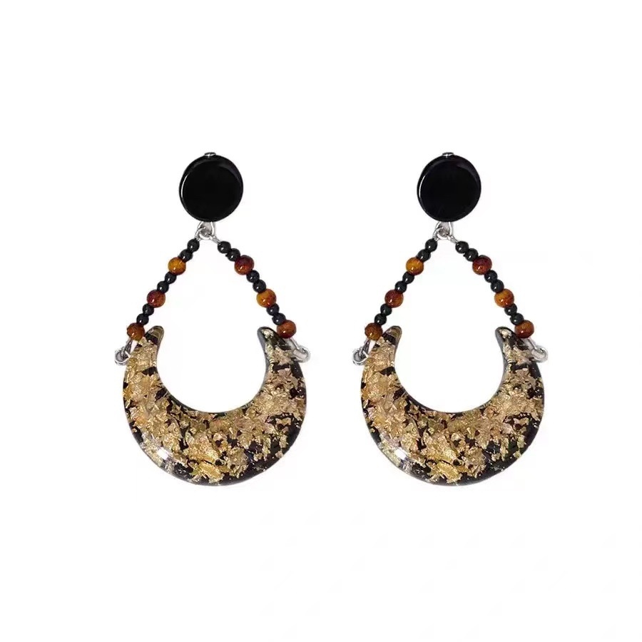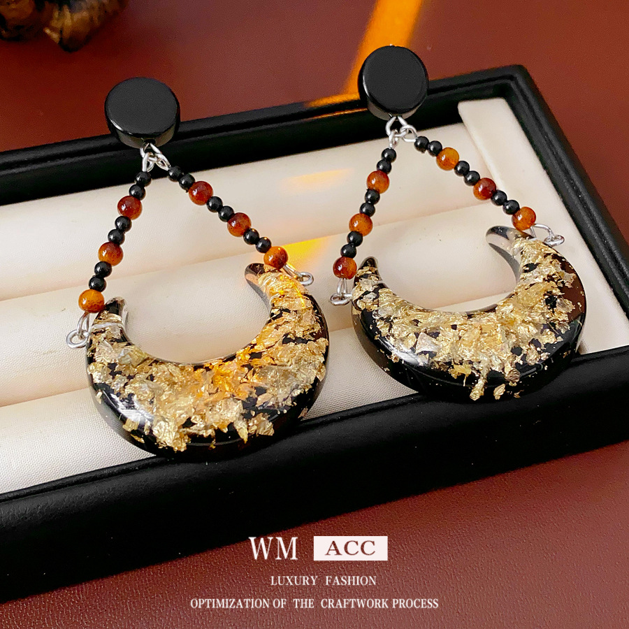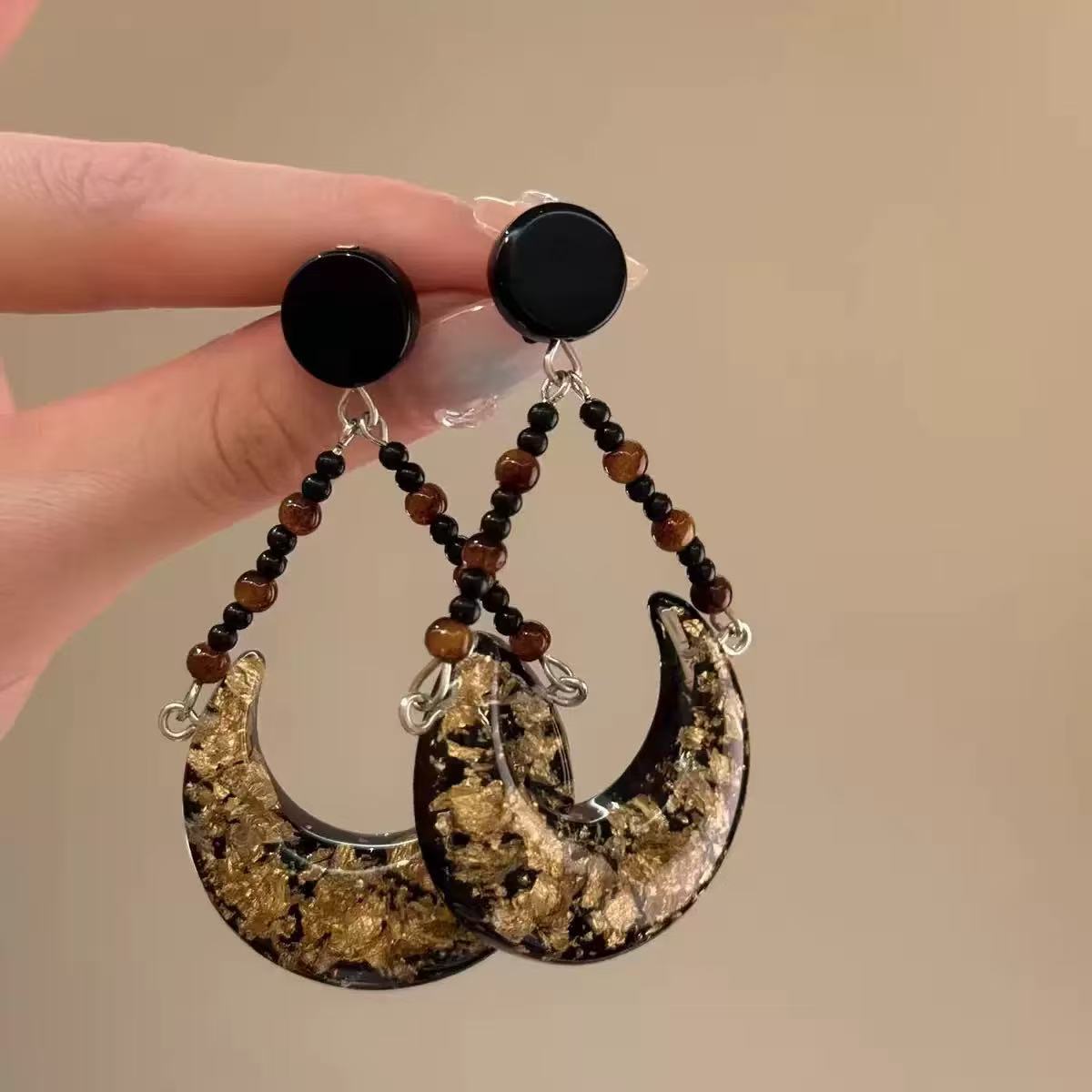 树脂金箔月亮串珠耳环小众轻奢高级感耳钉复古夸张个性设计感耳饰