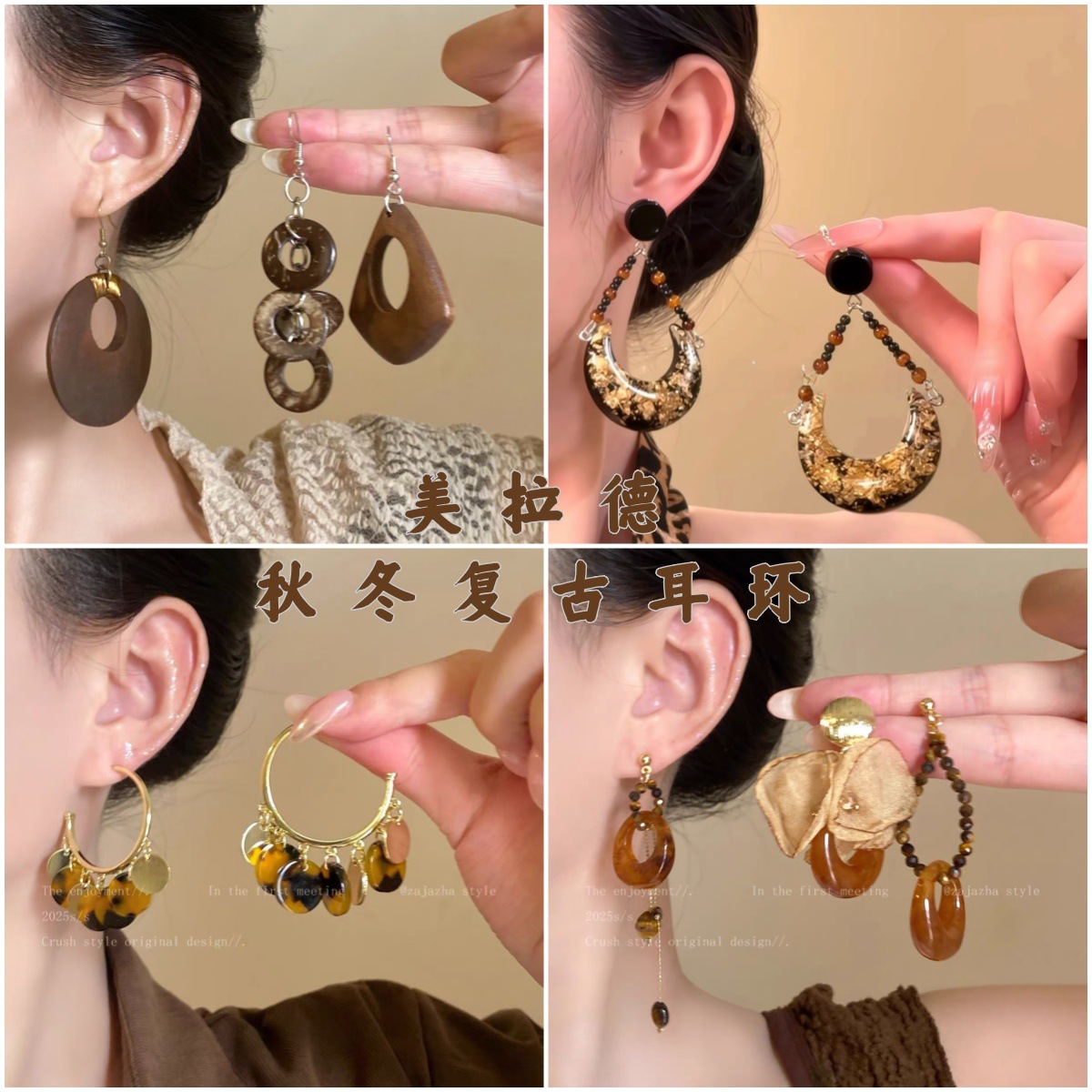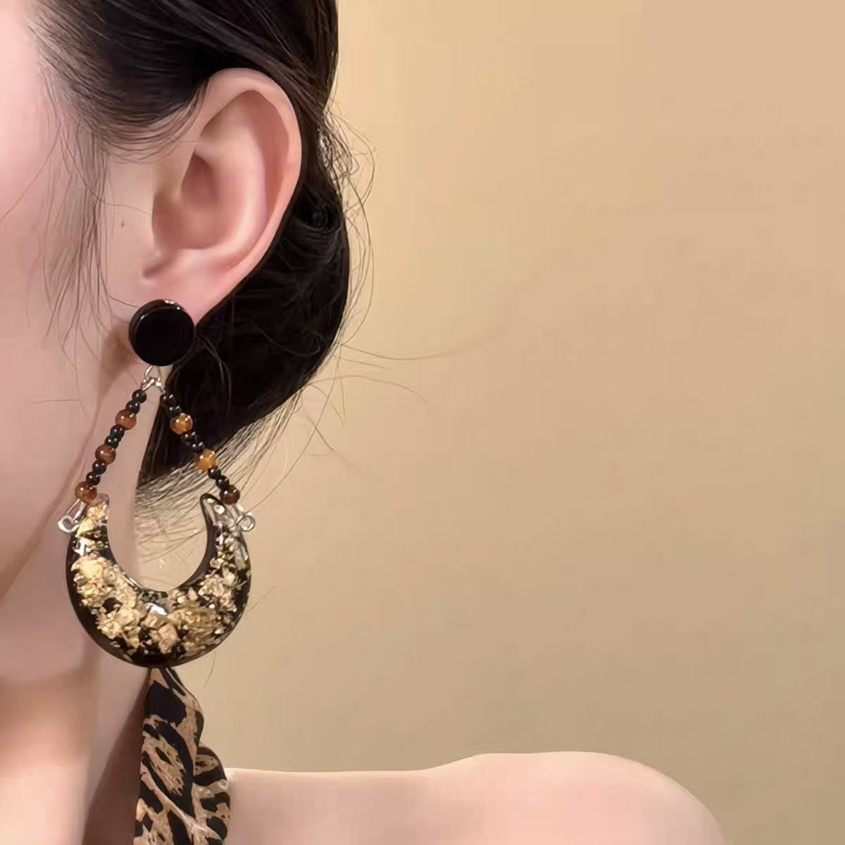 中古vintage树脂金箔月牙耳环设计感小众耳钉复古气质高级感耳饰