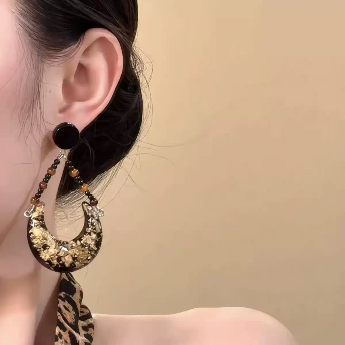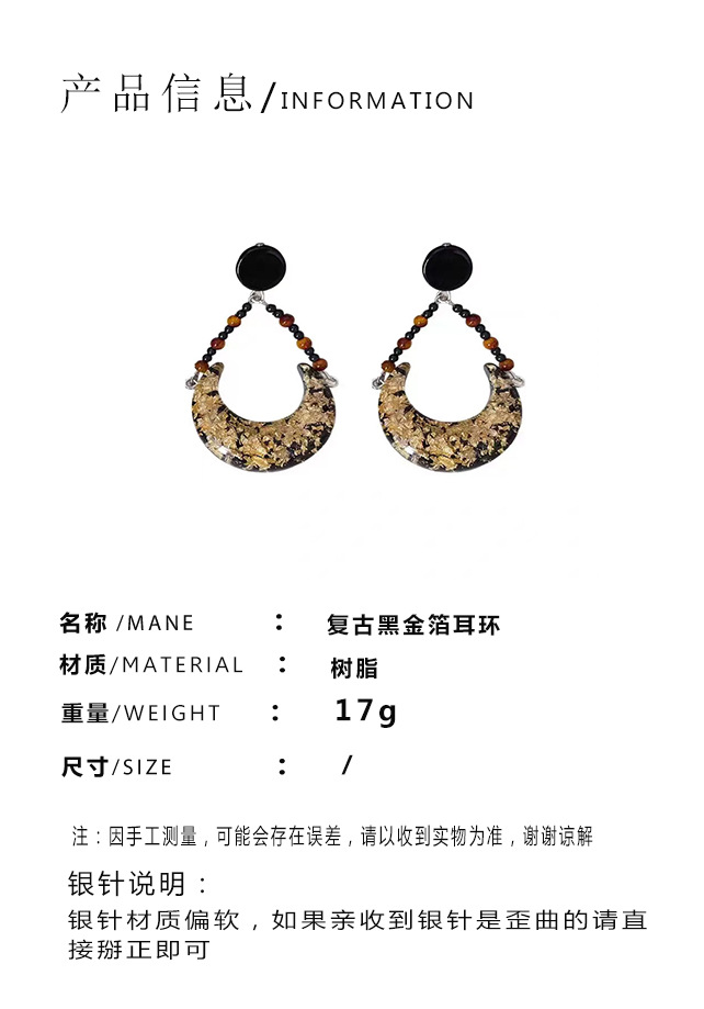 新款月牙形黑金箔港风串珠耳环复古气质高级感时髦几何耳钉耳饰