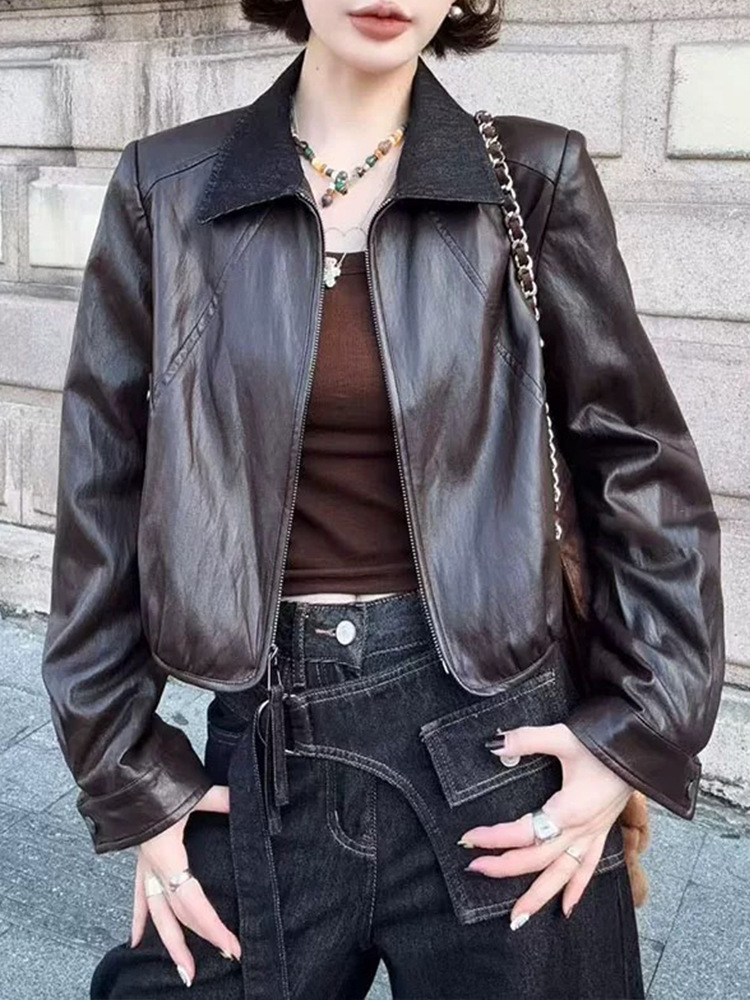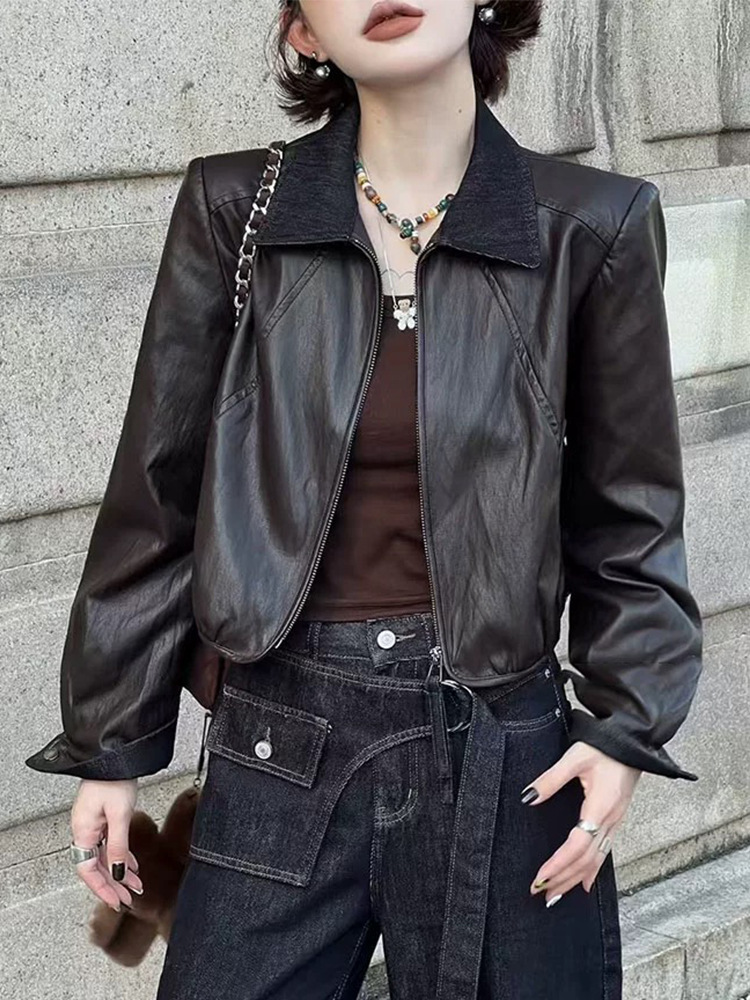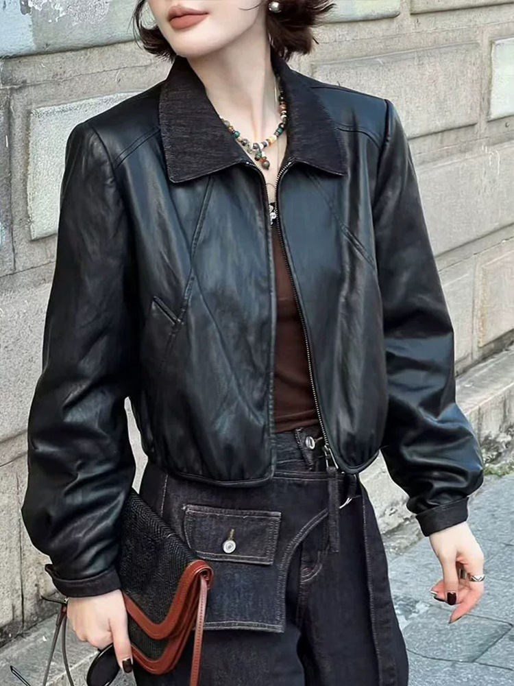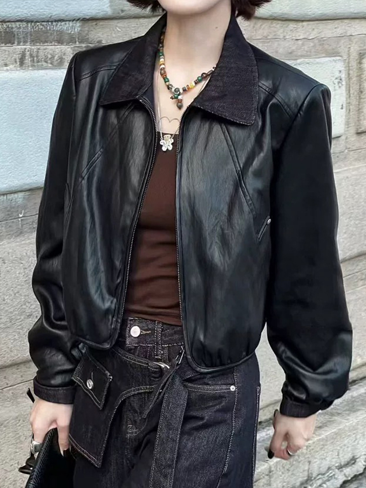 翻领短款PU皮衣外套女2025秋季新款韩版时尚气质百搭机车夹克上衣