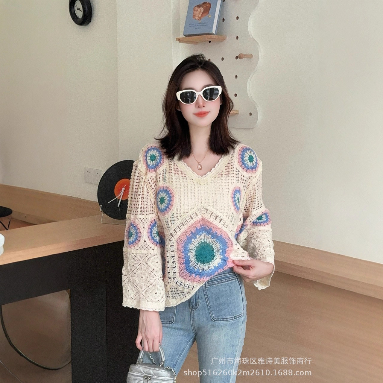 ハンドフックニット長袖上着春秋新作ボヘミアンカラー格子鉤織手作り女装クロスボーダー