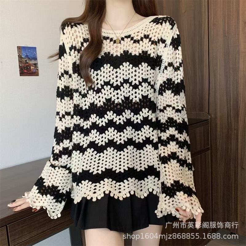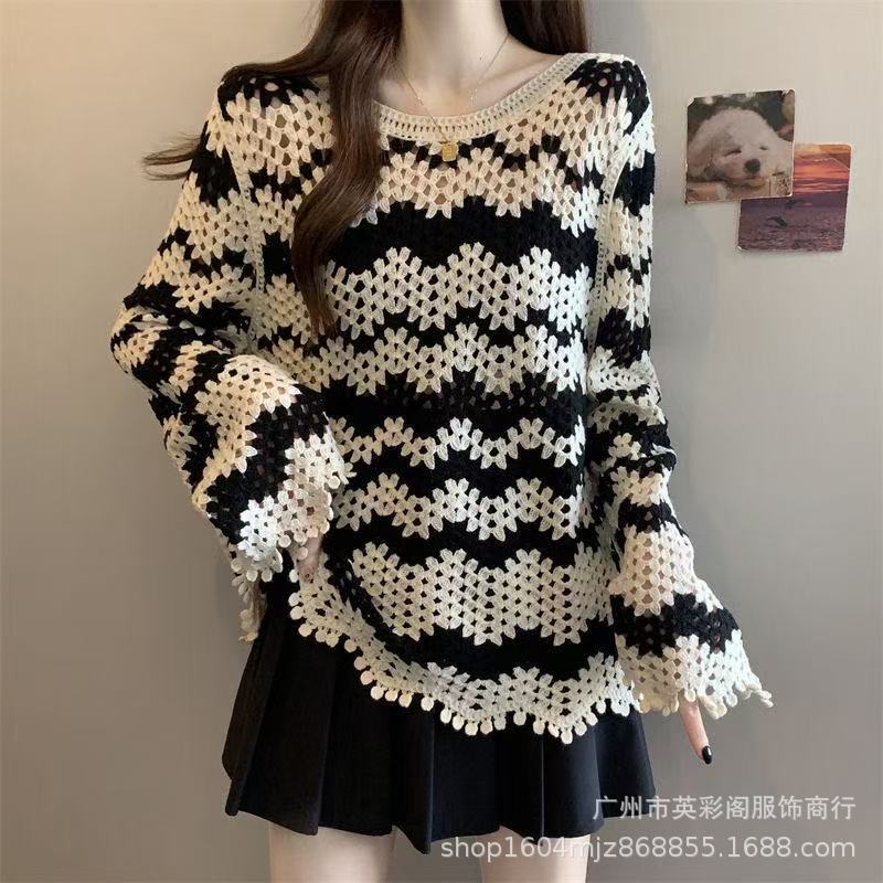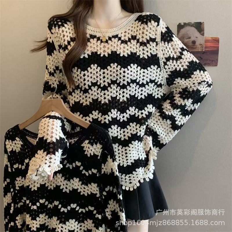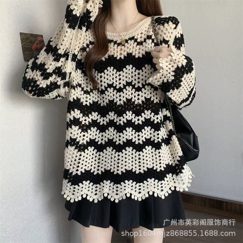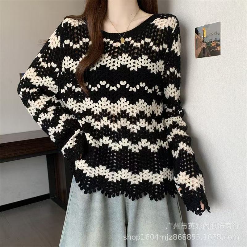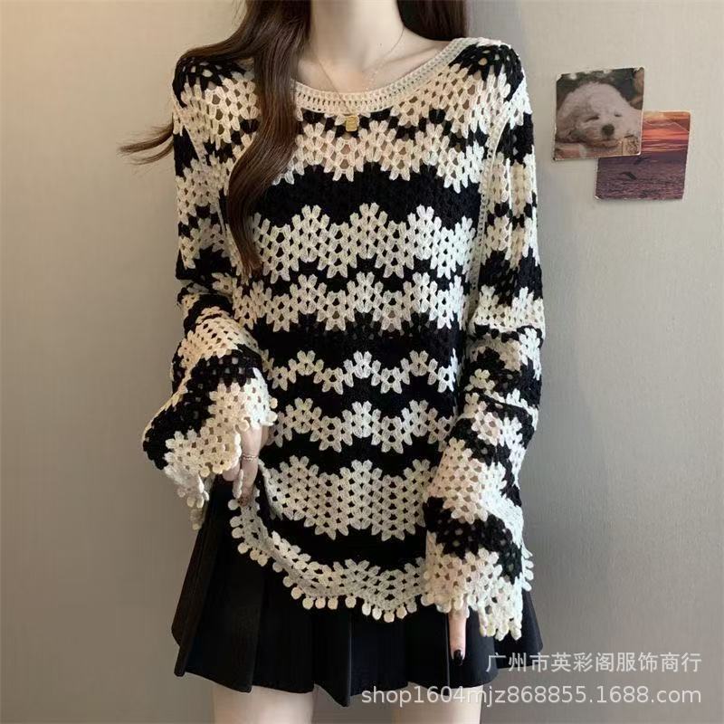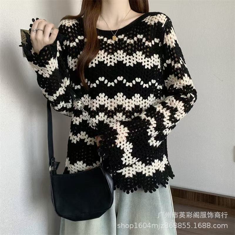 法式高级感镂空钩花长袖针织衫女秋季新款显瘦百搭减龄条纹上衣潮