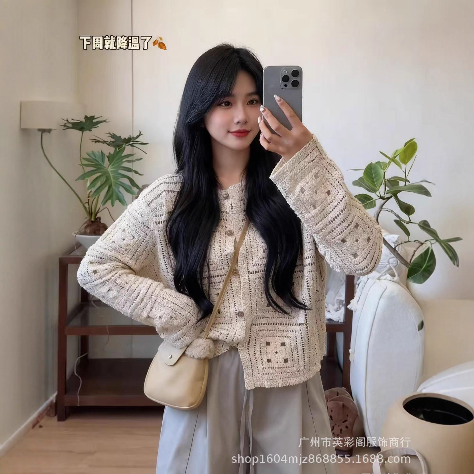 秋季新款温柔风重工钩花镂空针织开衫女时尚宽松显瘦纯色上衣外搭