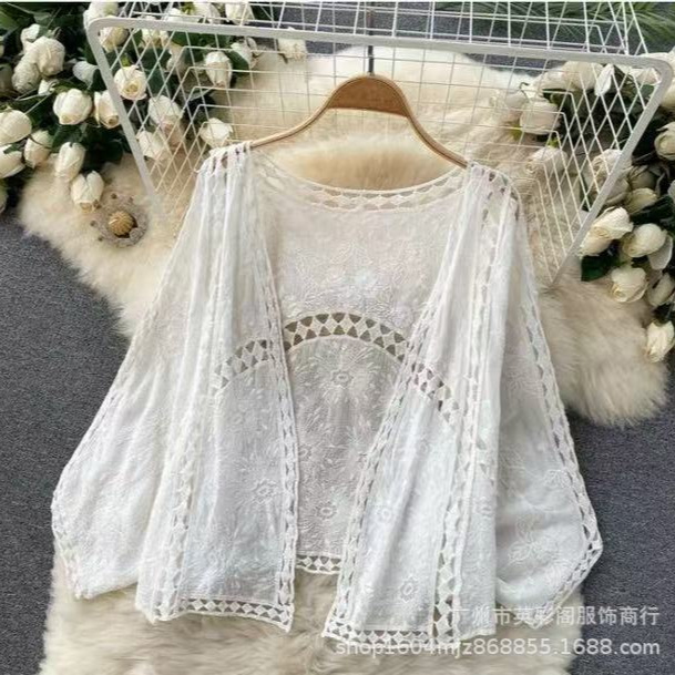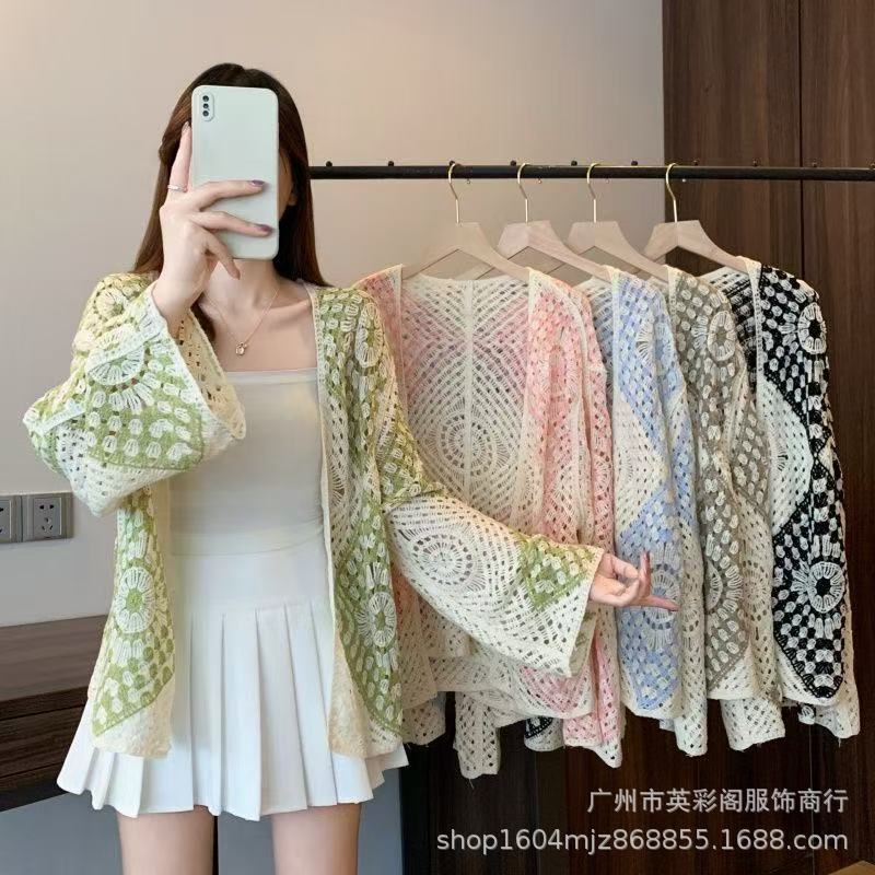 甜美清新外搭宽松百搭披肩外套女海边度假风蝙蝠袖钩花镂空针织衫