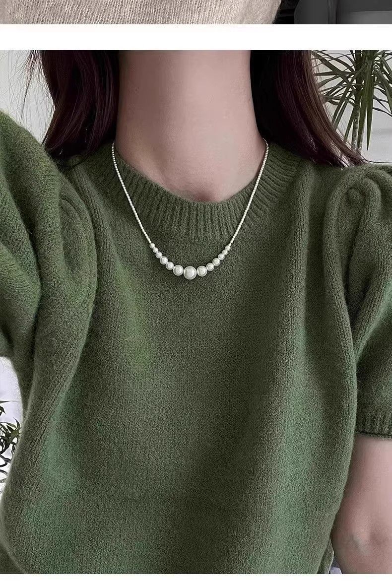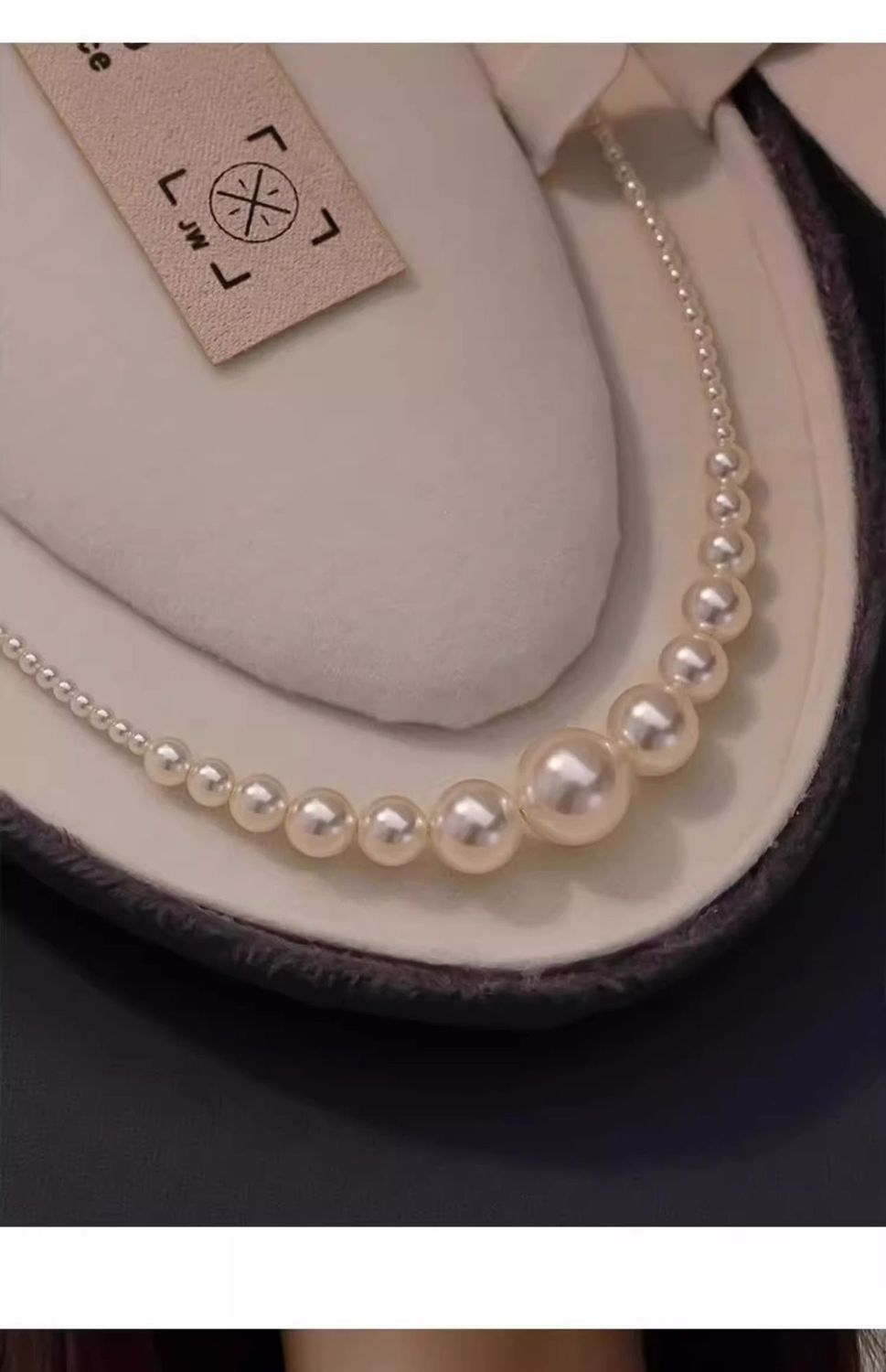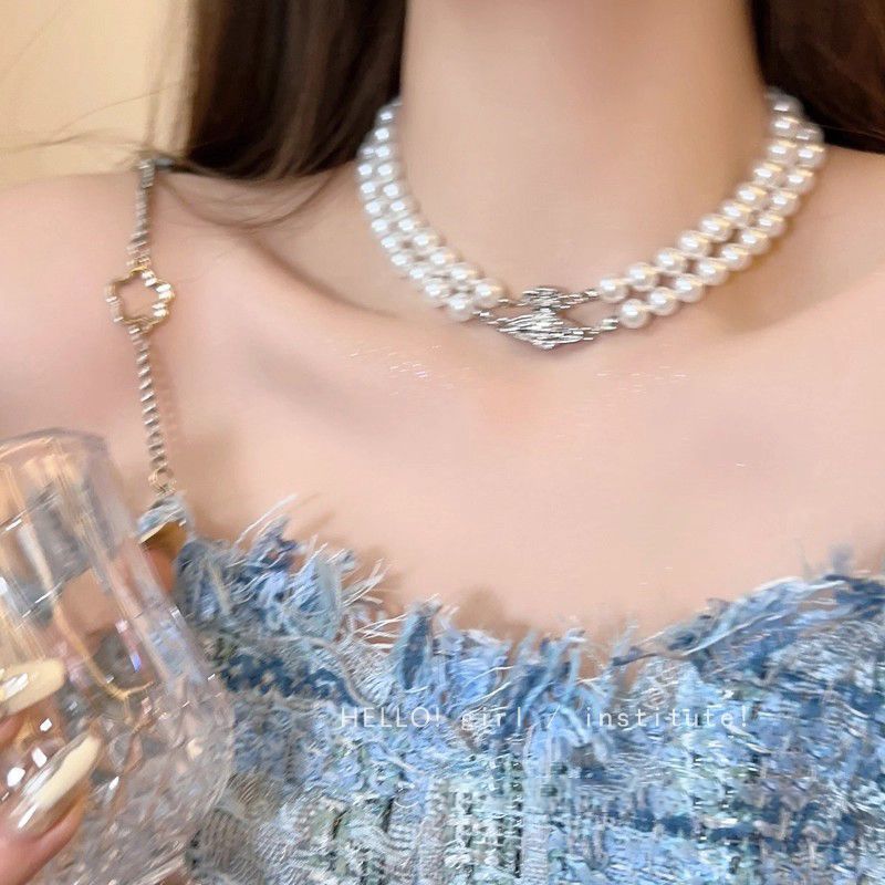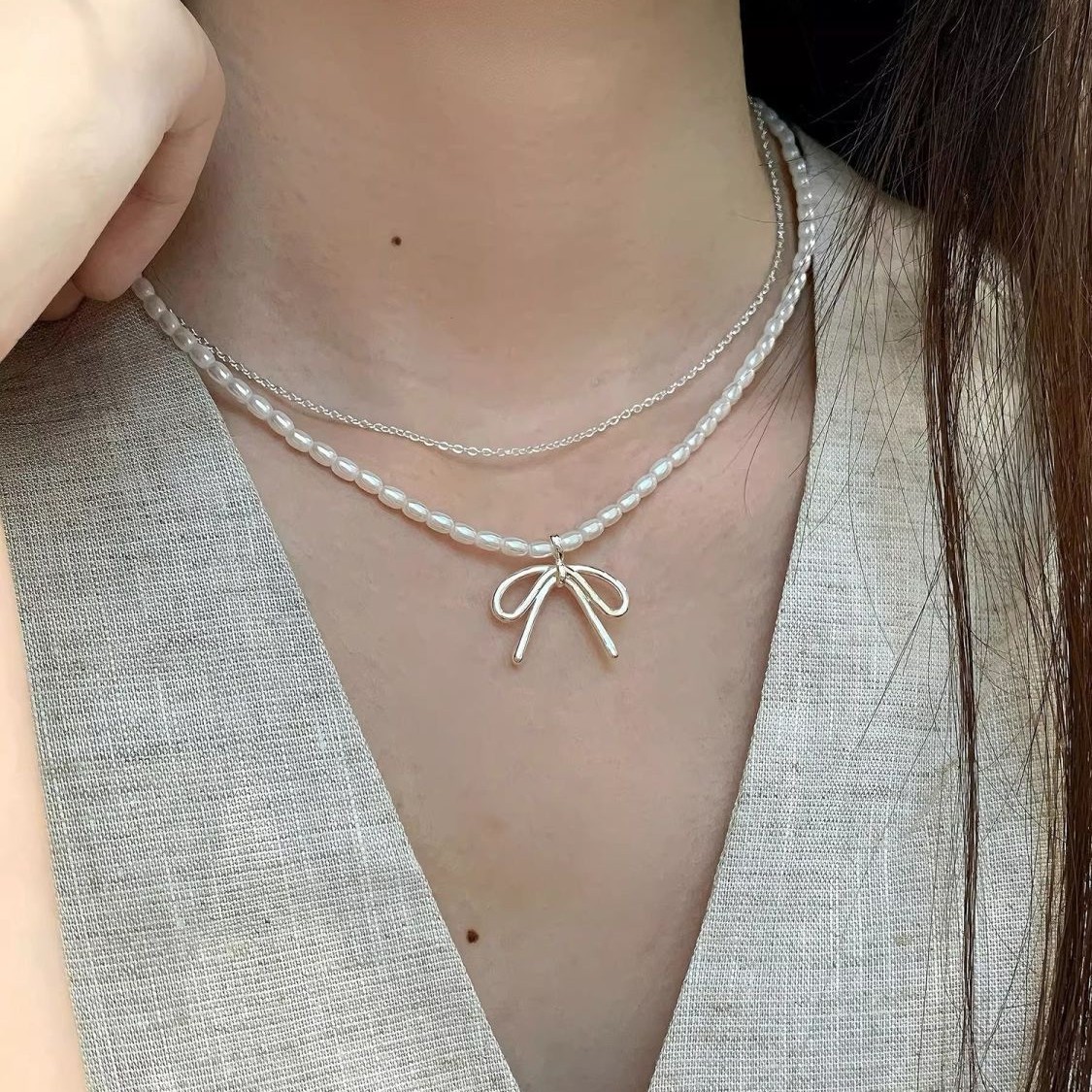 2025新款 月下白茶 蝴蝶结施家米粒珍珠双层项链ins少女感锁骨链