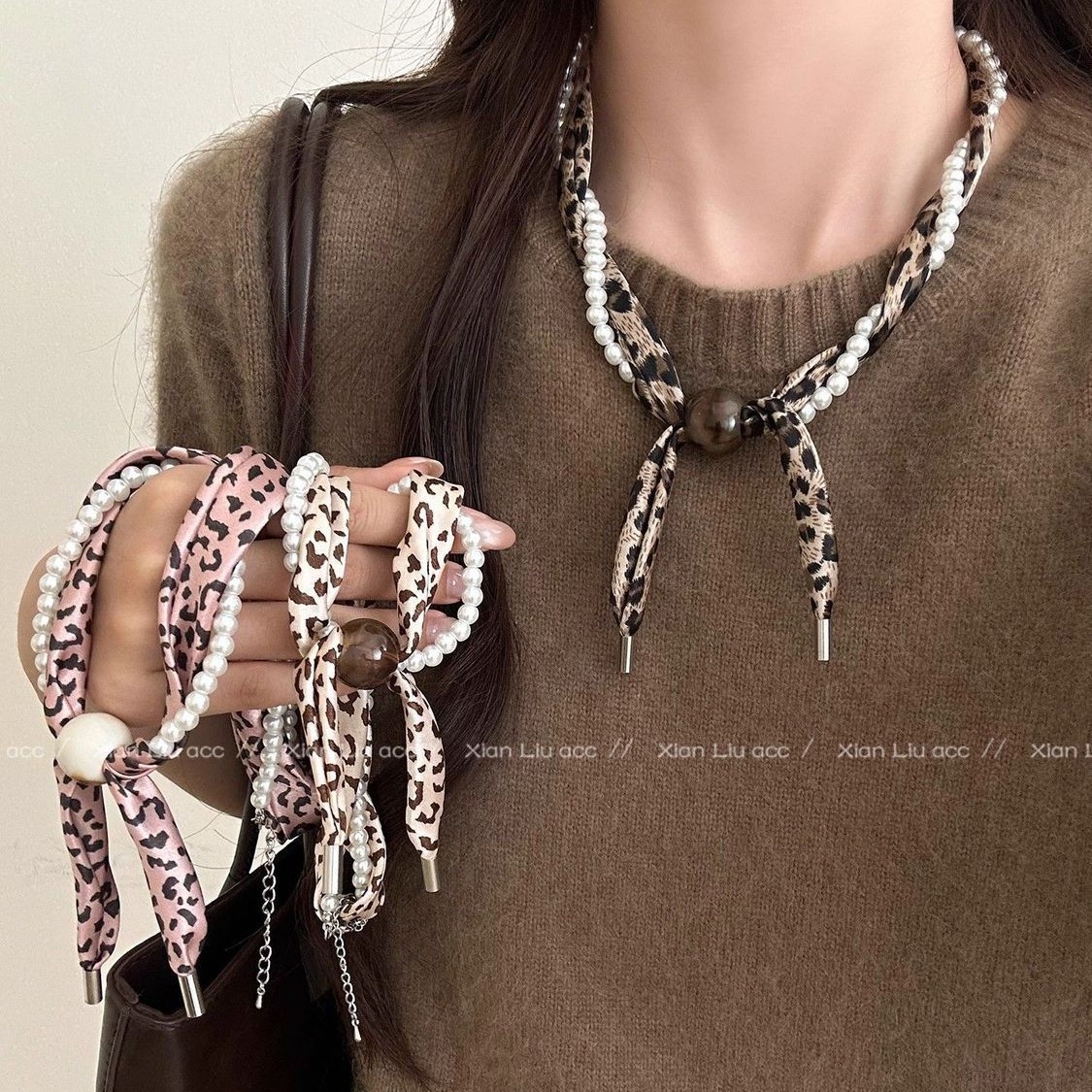美拉德豹纹双层缠绕珍珠丝巾项链女小众设计感毛衣链配饰2025新款