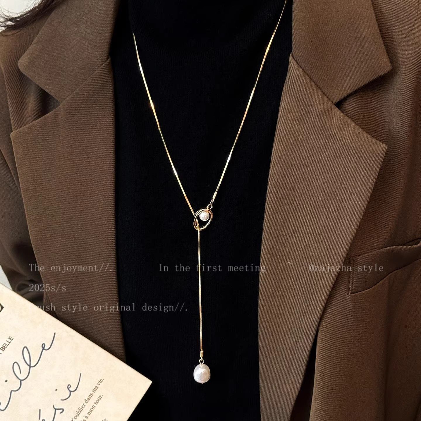 金色珍珠长款吊坠项链女秋冬气质高级感轻奢毛衣链复古可调节配饰