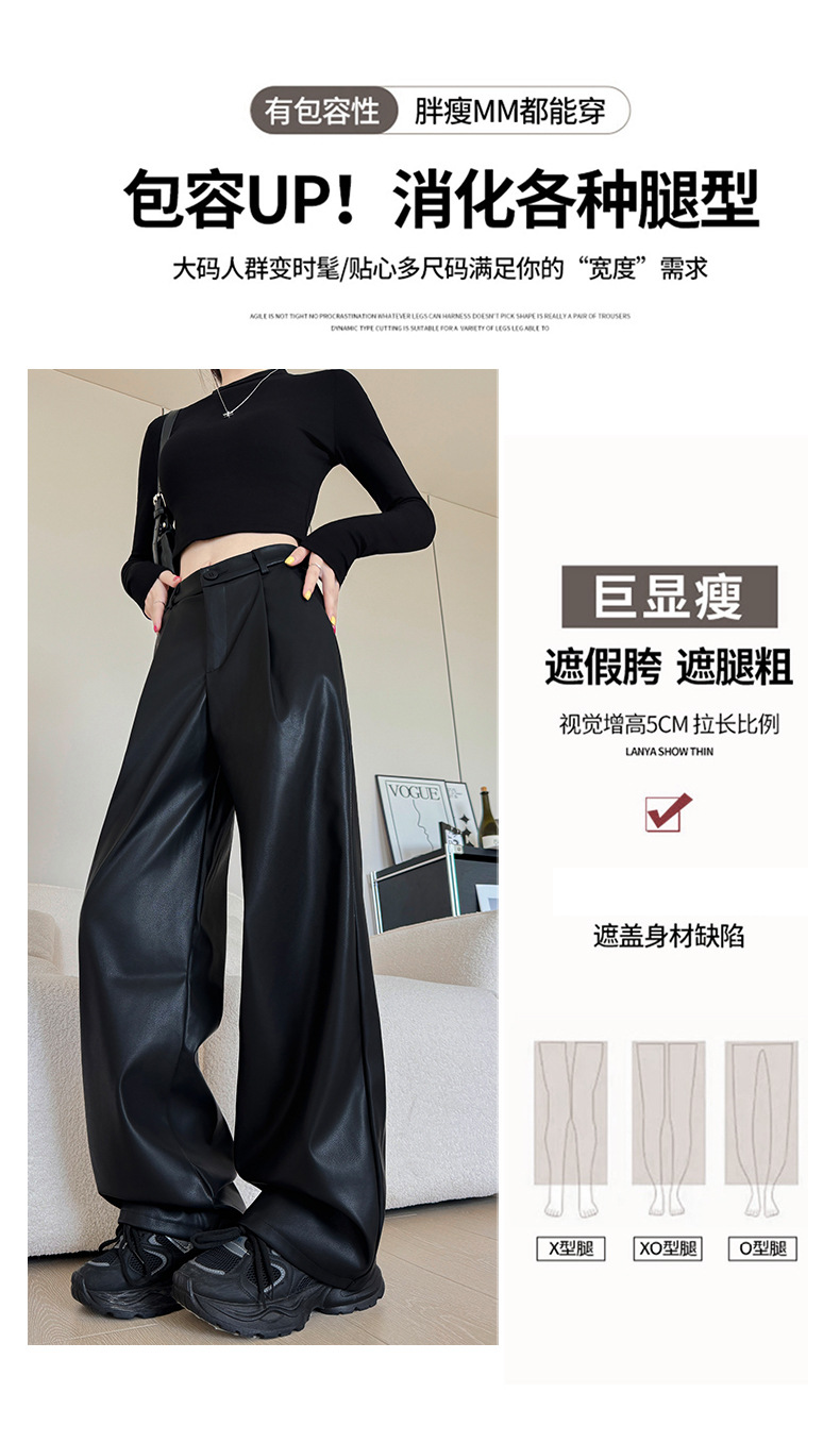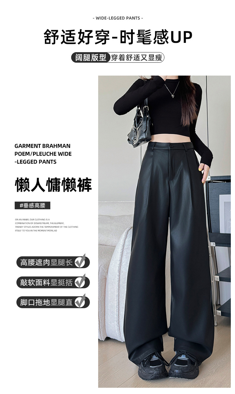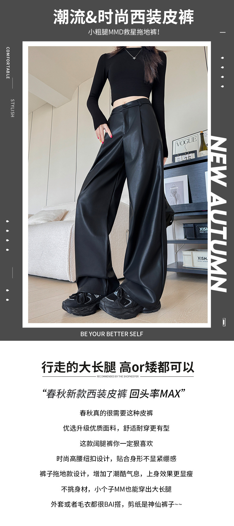 新款美式PU皮裤女春秋冬高腰显瘦垂感休闲直筒裤宽松西装阔腿裤子