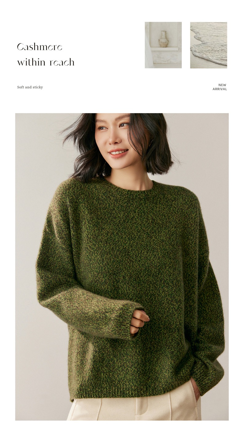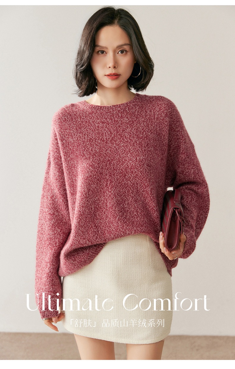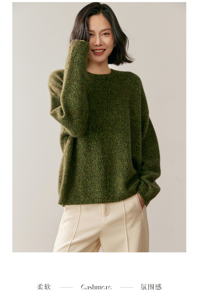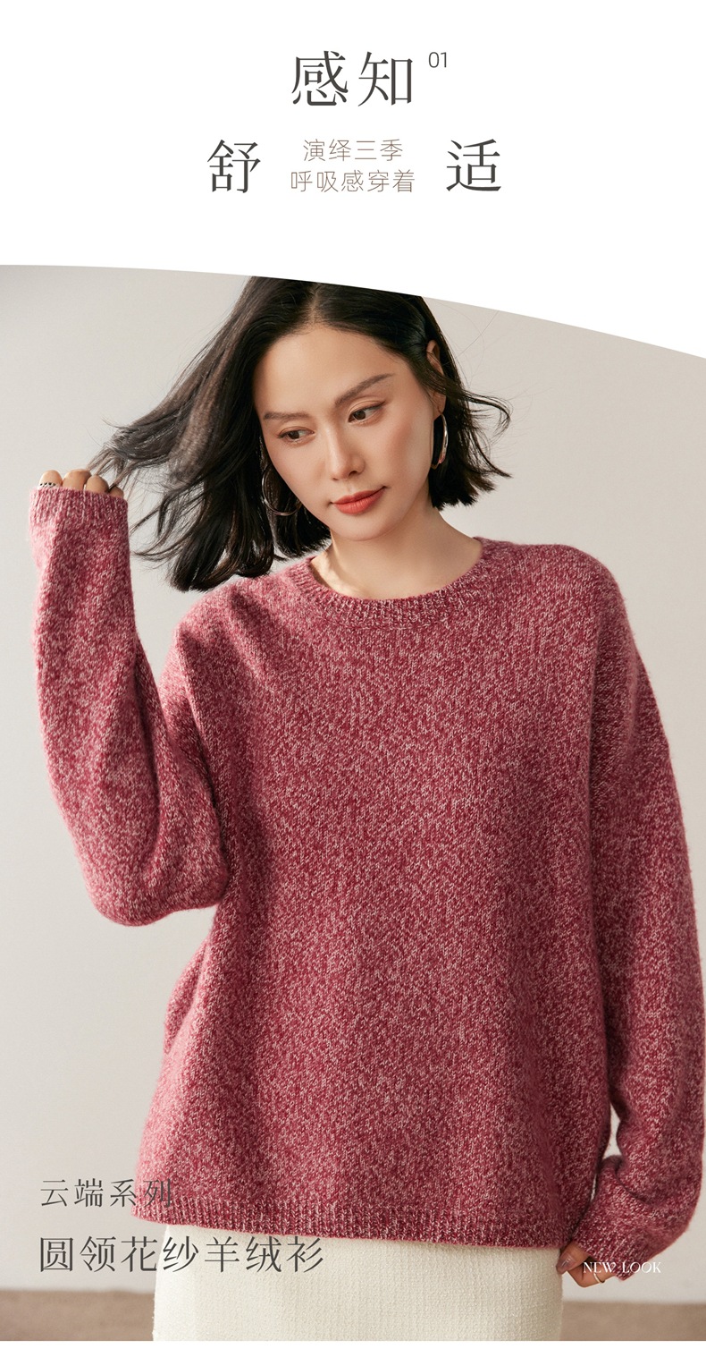 山羊绒衫女圆领宽松毛衣落肩针织衫糯亲肤显士气质打底上衣软花纱