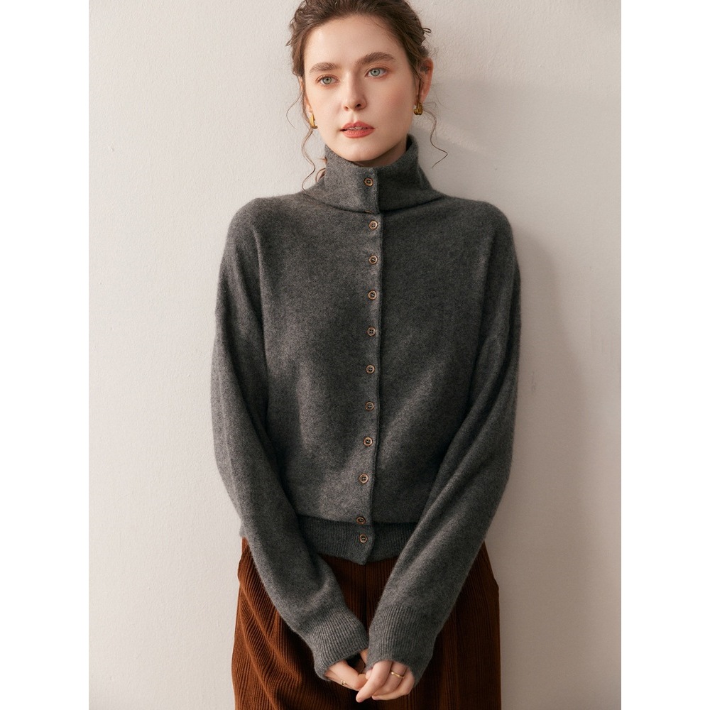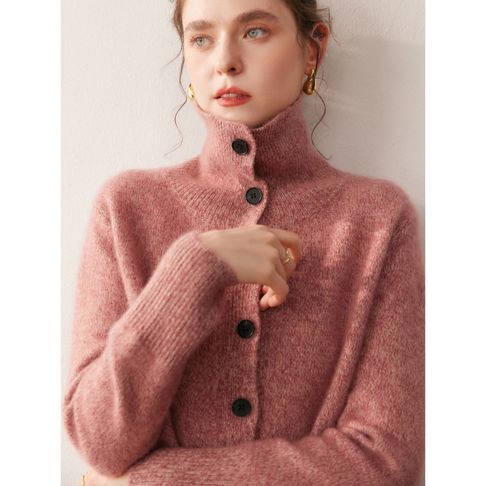 秋冬新款高领花纱开衫山羊绒衫女单排多扣气质通勤舒适软糯超厚款