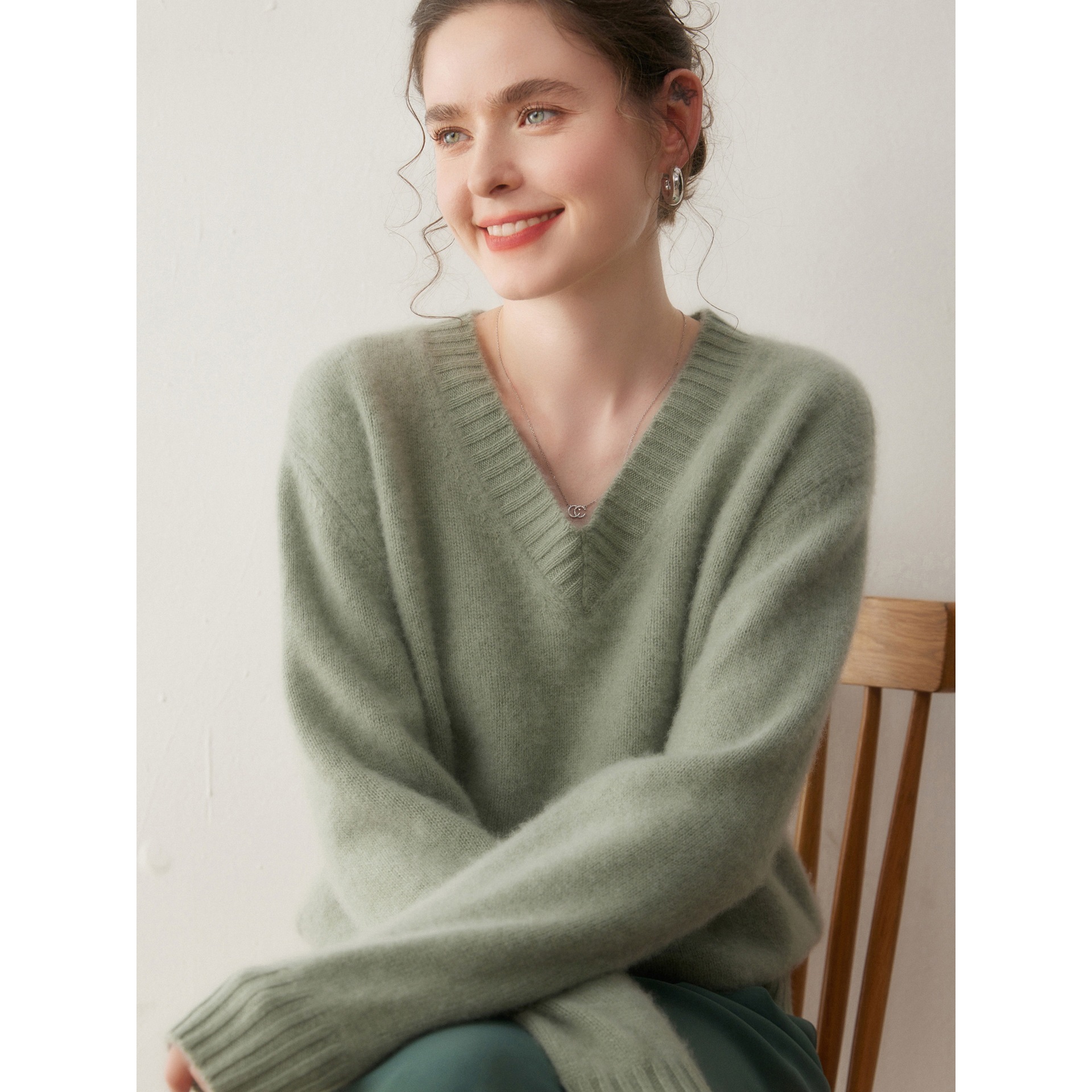 秋冬款纯色山羊绒针织打底衫宽松显瘦女V领套头毛衣内搭长袖上衣