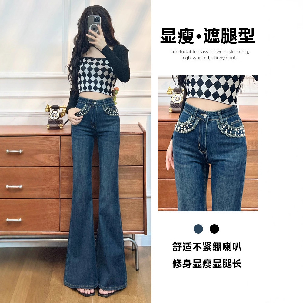 2025年春秋向け、高級感のあるラインストーン付き、小柄な女性向け、重工仕様の馬蹄型フレアデニムパンツ