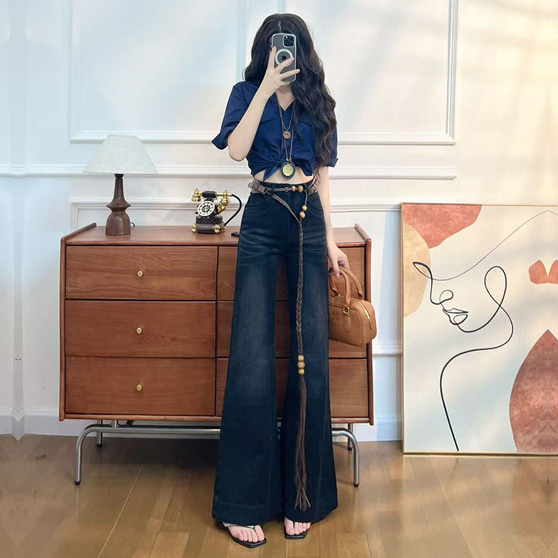 フォークのラッパのズボンの女性のタイプの2025年の春の夏服の薄いタイプの腰の爆発の薄い色の弾力の小さいラッパのデニムのズボン