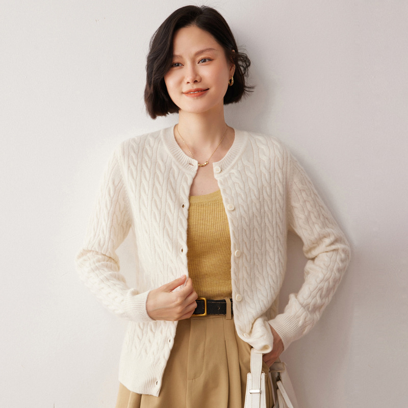 2024秋冬の女性の新型の純粋なカシミヤのカーディガンの麻の花のニットのコートの丸首のセーターのシンプルなファッションの組み合わせ