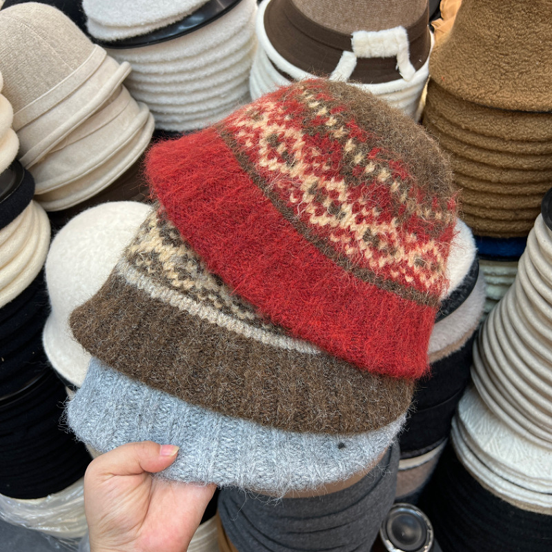 复古提花针织水桶帽子女秋冬新款显脸小保暖毛线盆帽休闲渔夫帽