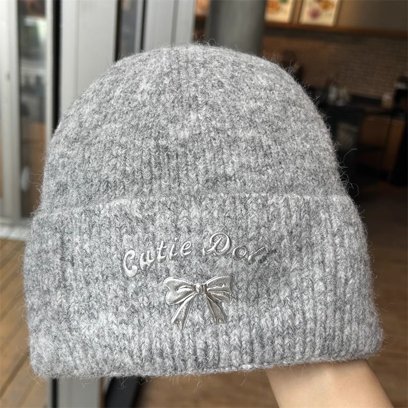 韩版新款蝴蝶结可爱纯色针织帽子秋冬显脸小毛线帽保暖护耳帽子潮