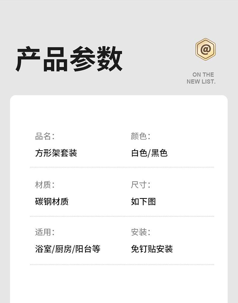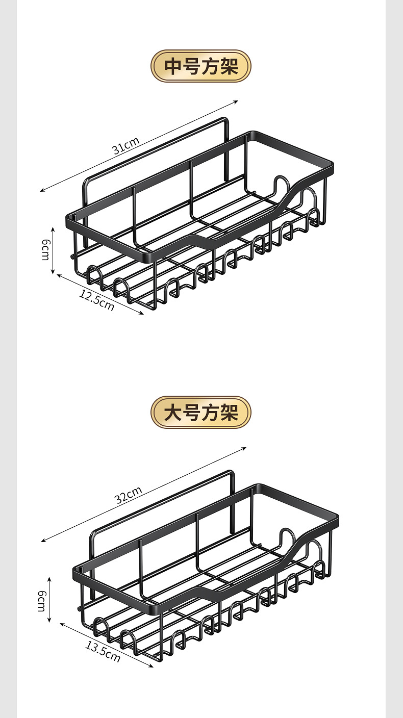 尺寸 大号方架白,大号方架黑,中号方架白,中号方架黑,肥皂架白,肥皂架黑,牙刷架白,牙刷架黑