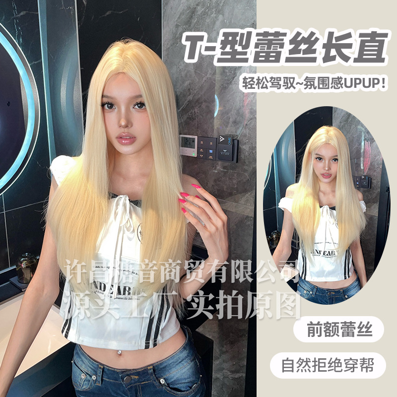 糖音假发女长直发洋气白金色直发全头套手织T型蕾丝仿真自然分界