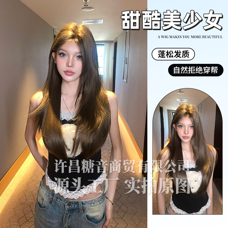 糖音假发长直发女日常小额蕾丝巧克力渐变全头套假发