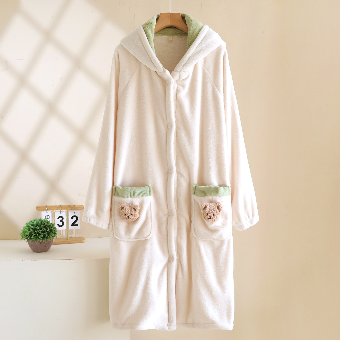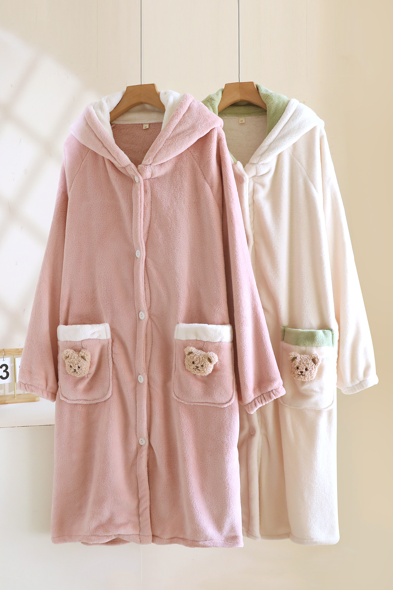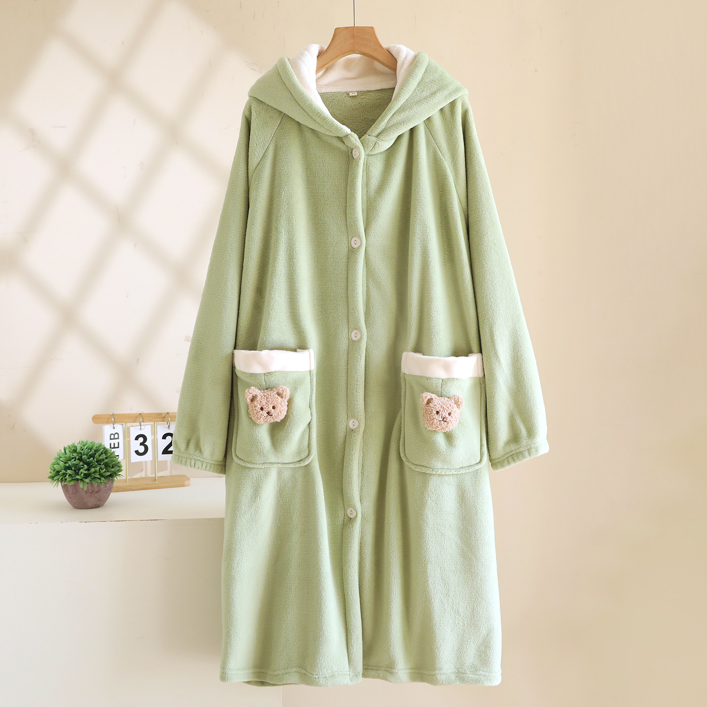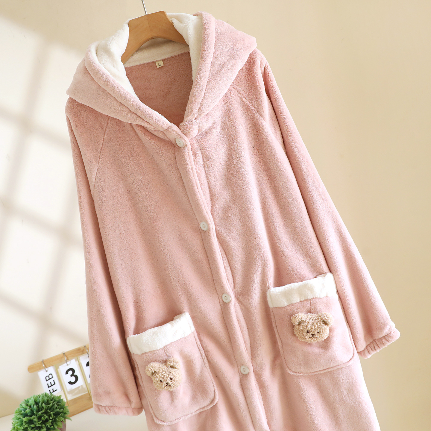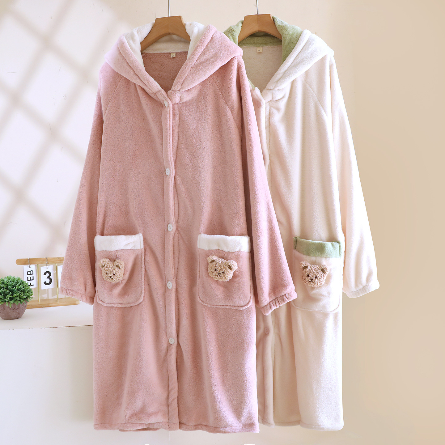 秋冬日系中长款女士法兰绒浴袍珊瑚绒家居服睡袍加厚保暖睡衣睡裙