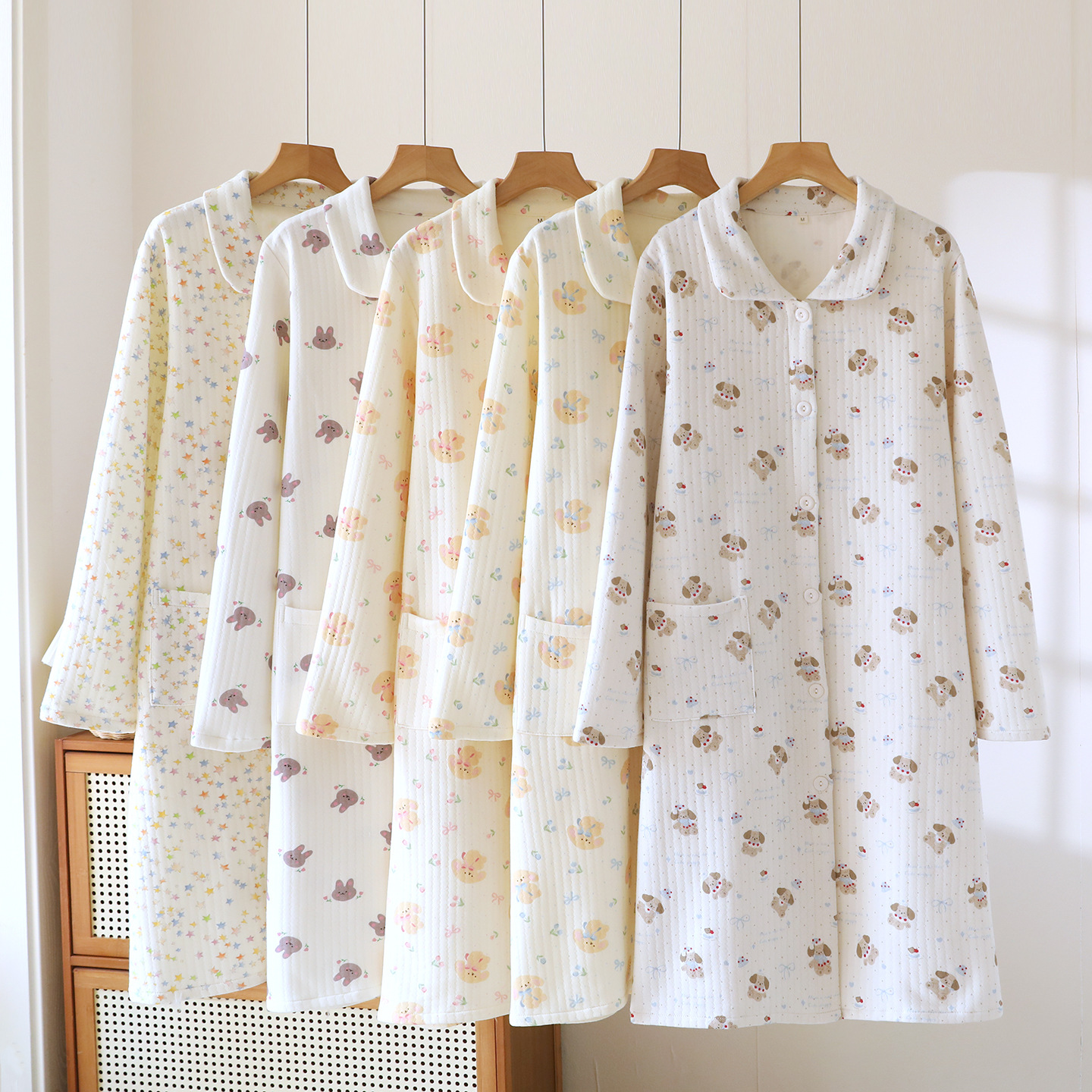 空气层睡裙秋冬女士夹棉加厚保暖长袖开衫睡衣裙宽松家居服可外穿