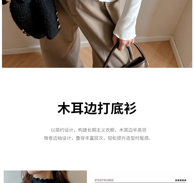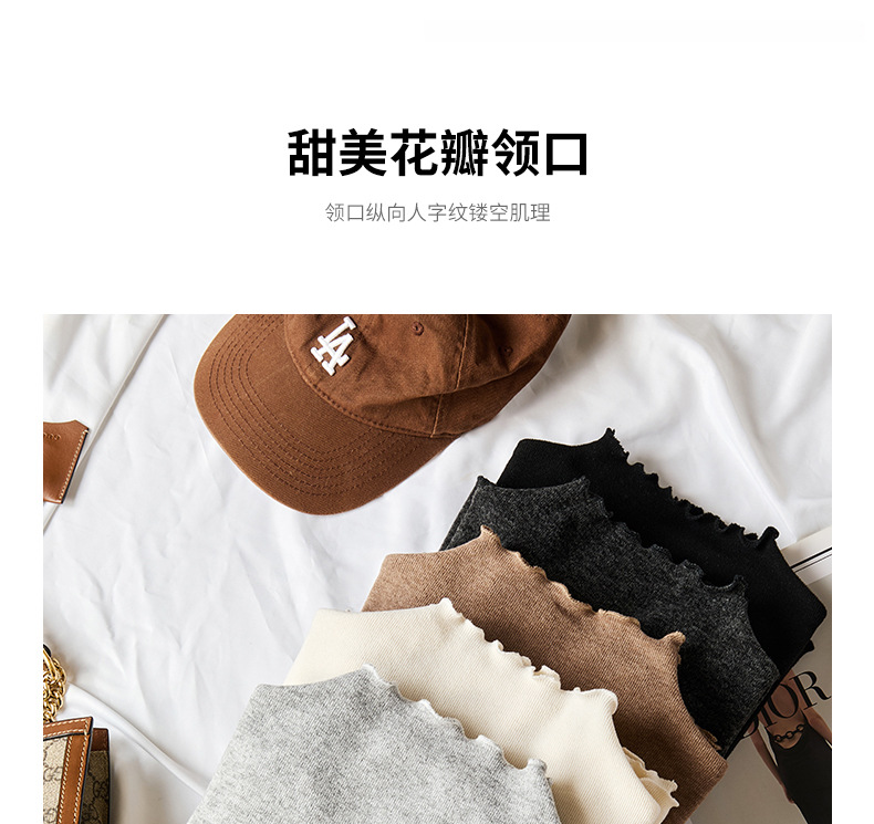 严选白色木耳边长袖内搭打底衫女早秋设计感仿羊绒正肩可外穿上衣