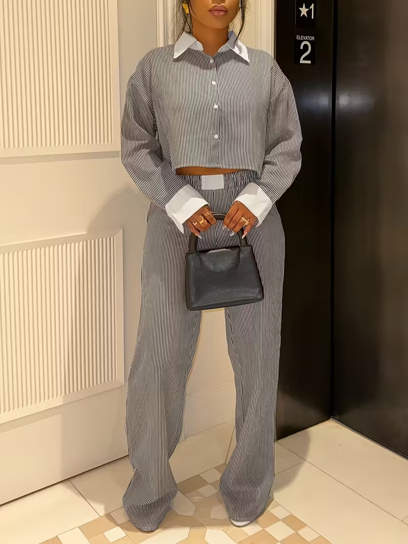 2025欧美跨境外贸女士套装英伦风长袖衬衫两件套条纹斑马纹