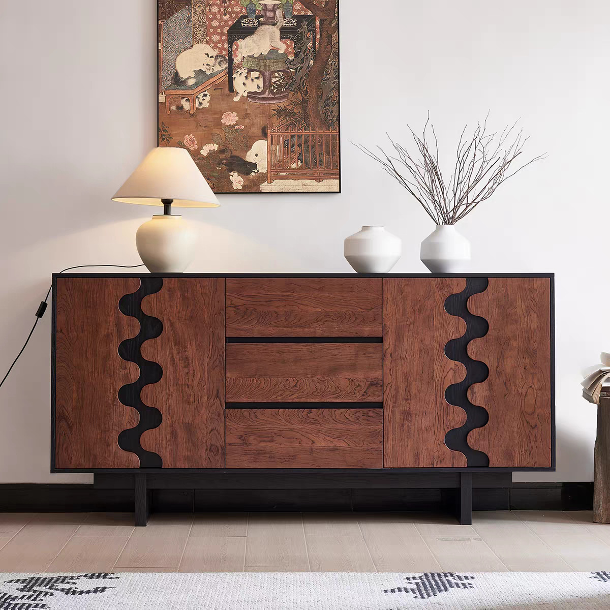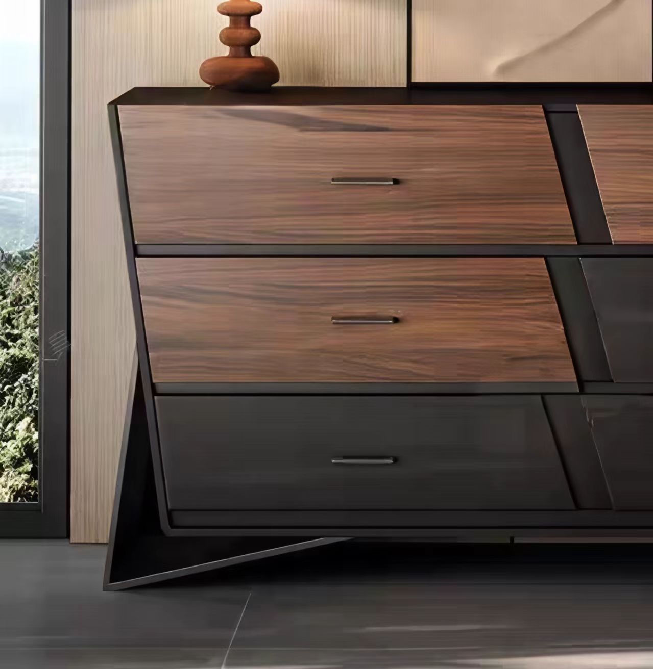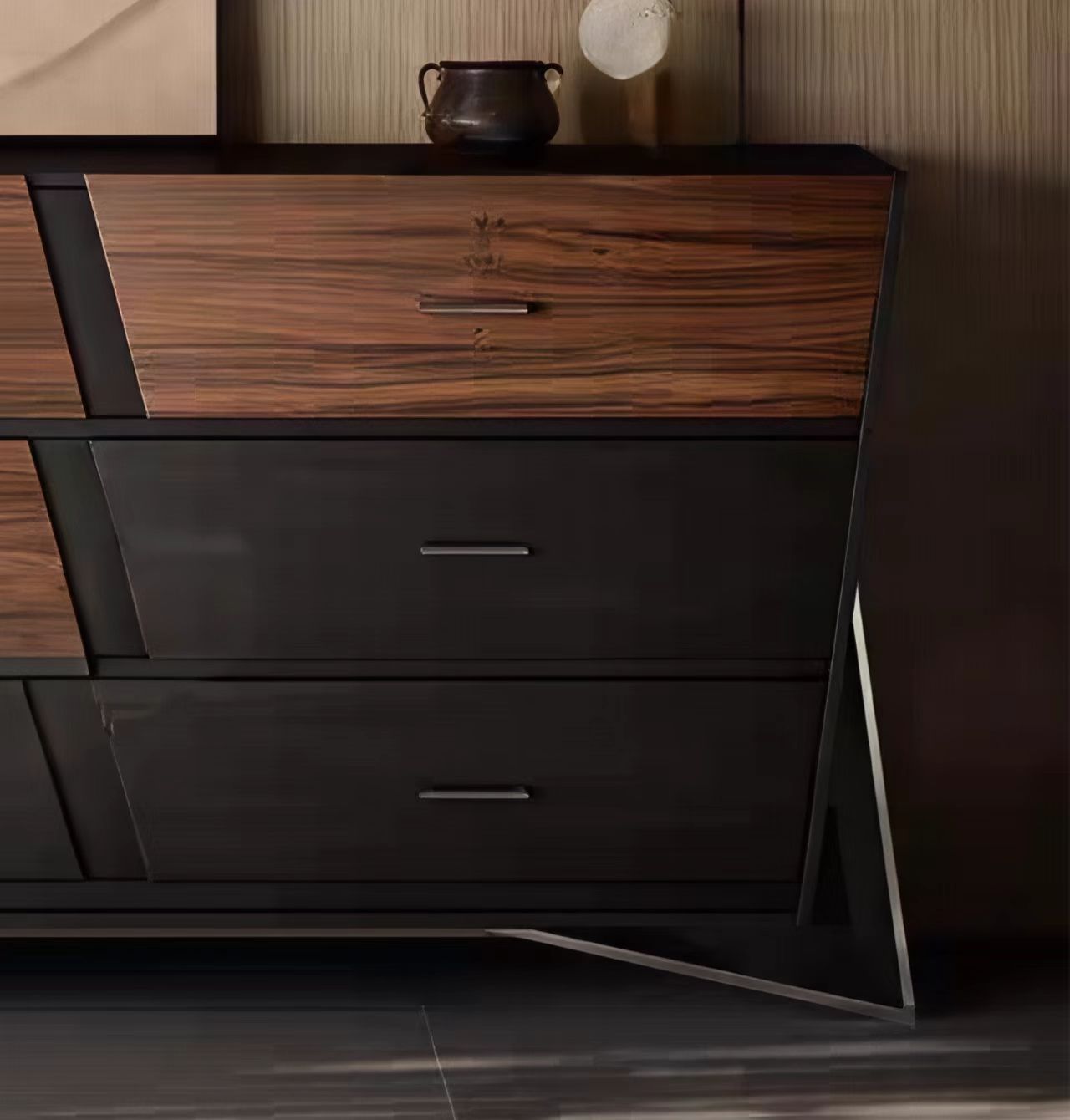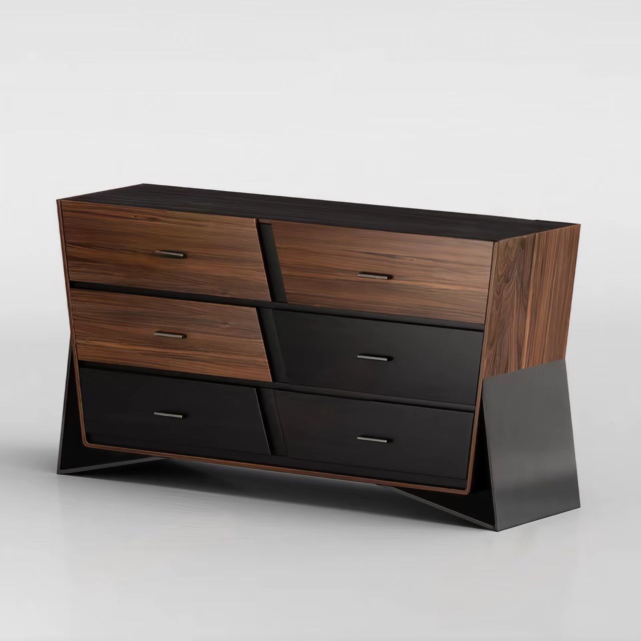 胡桃色加黑色木纹!拖底缓冲轨道加布纹抽屉!多层实木,采用钢板底座!整装!
