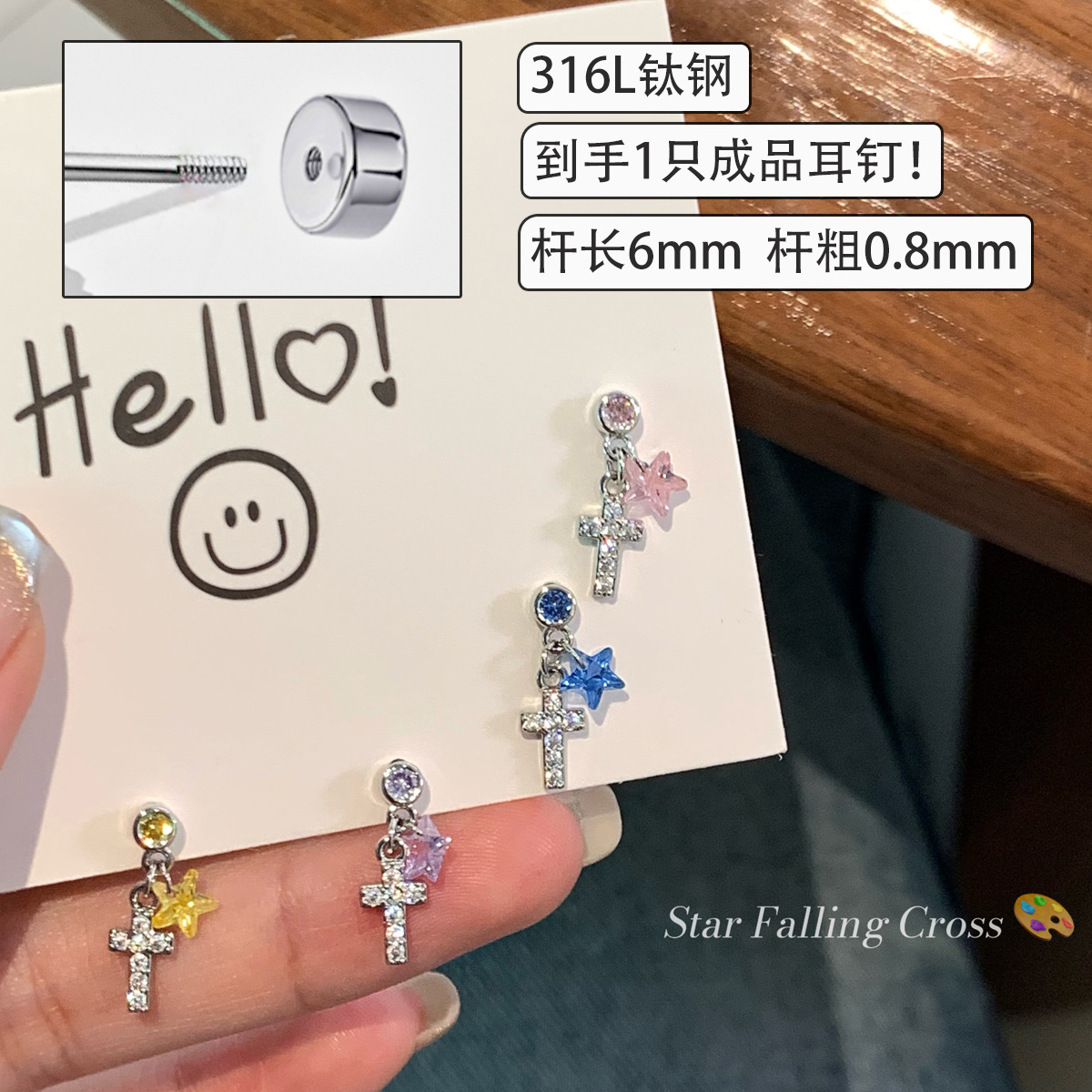 316L医用钛钢耳钉百搭四芒星镶锆石耳骨钉养耳洞十字架耳蜗钉耳饰