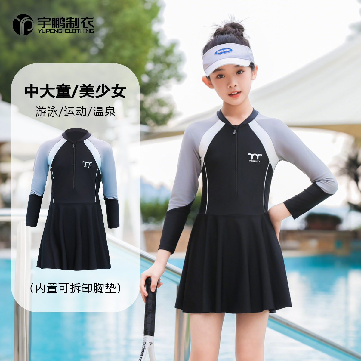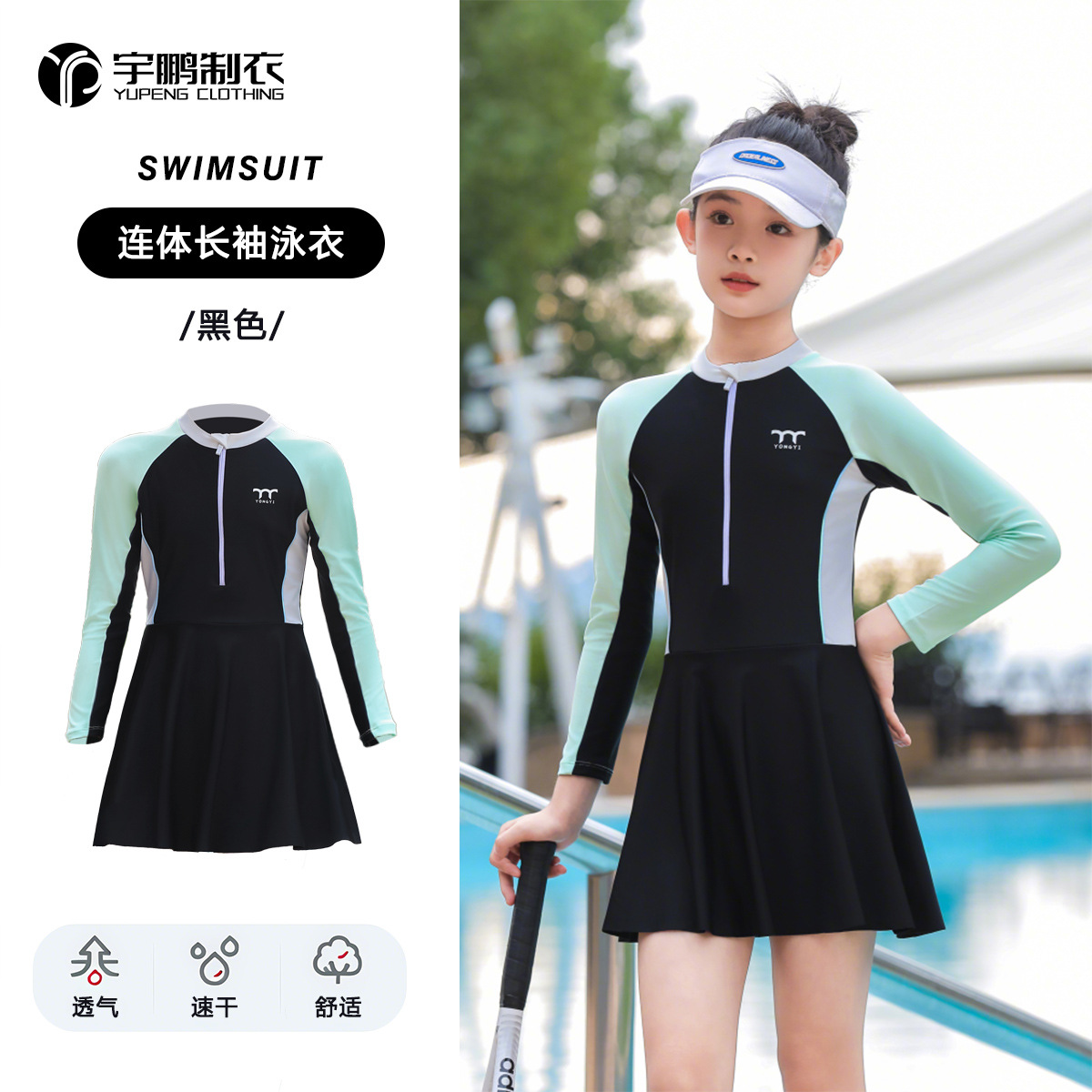 子供水着ワンピース女の子長袖コントラストカラー日焼け止めコンサバ中学生プールウォーターパーク露出防止水着