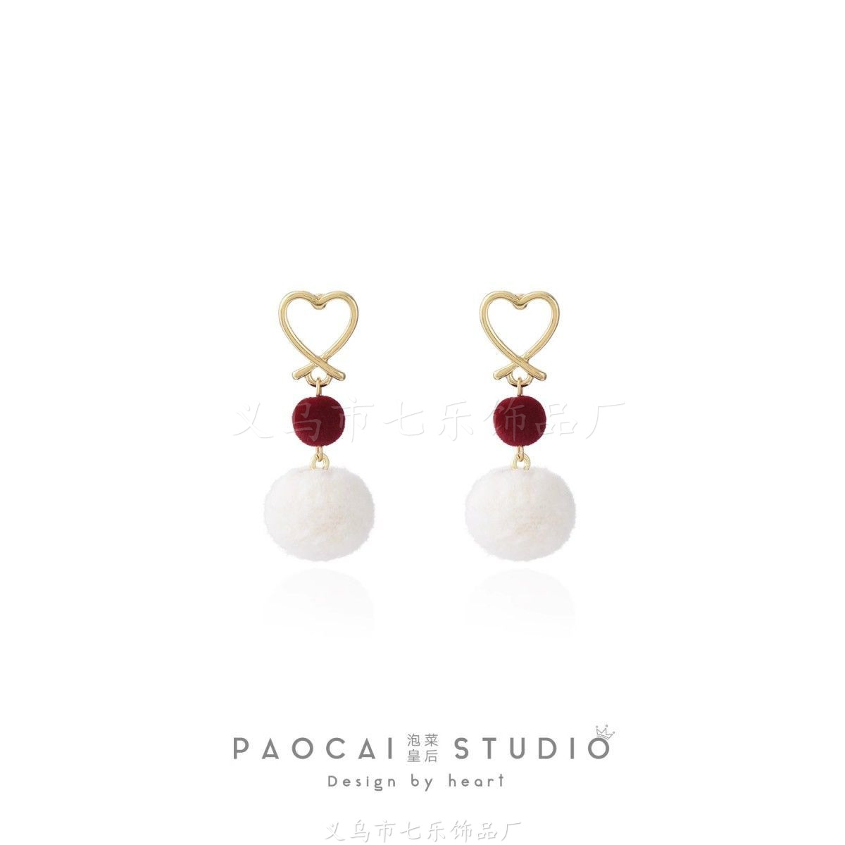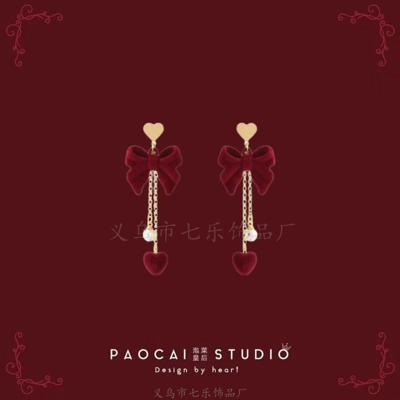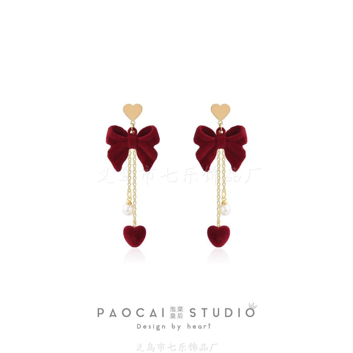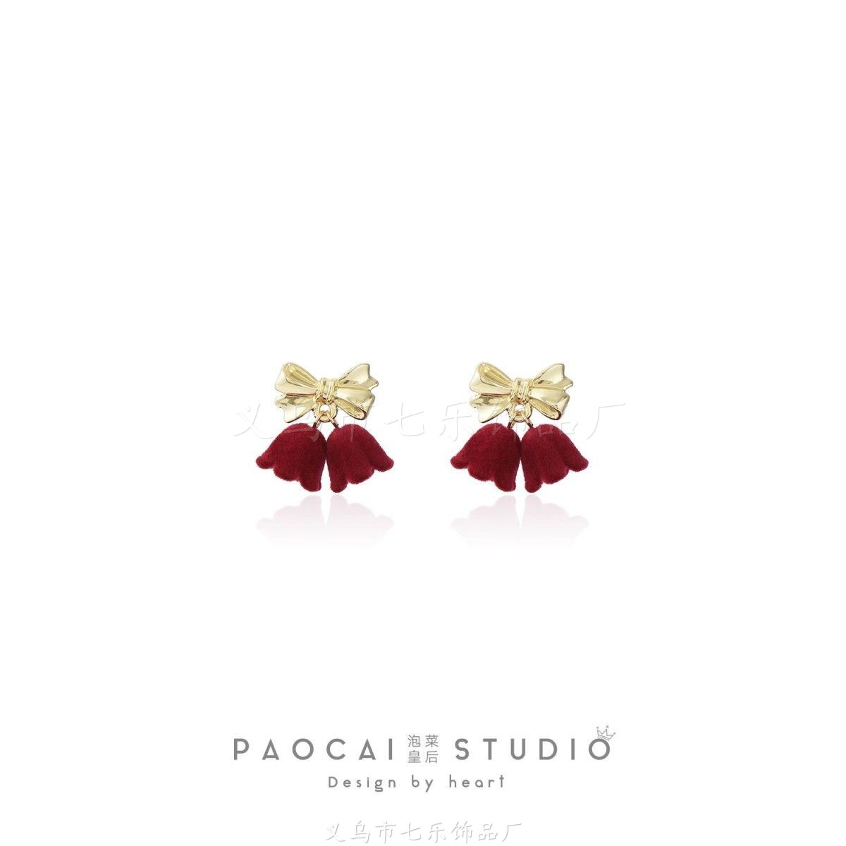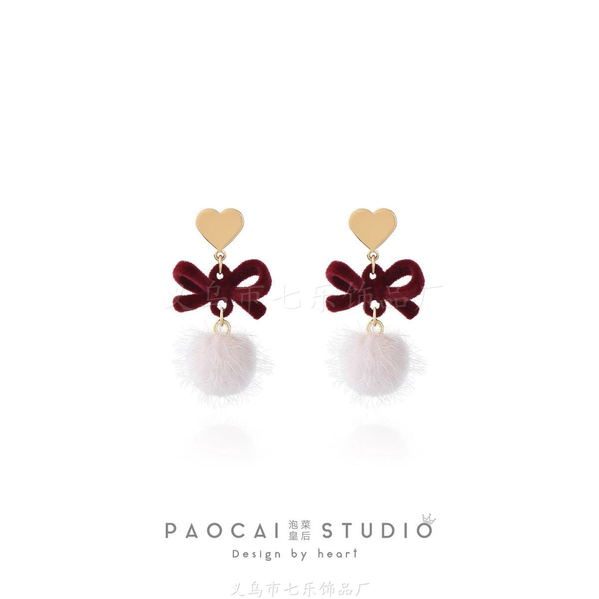 红色新年植绒蝴蝶结毛球耳钉小众高级感耳饰过年结婚小众高级耳环