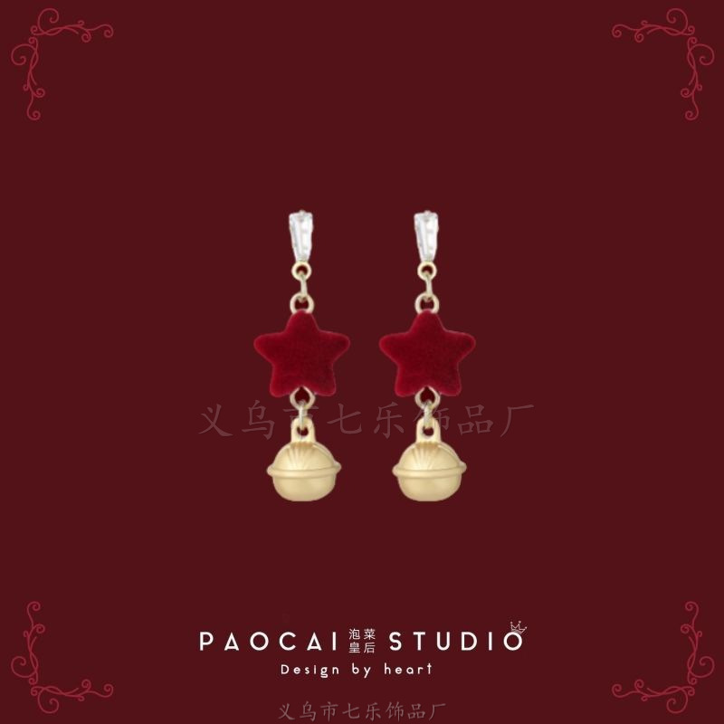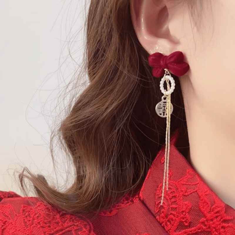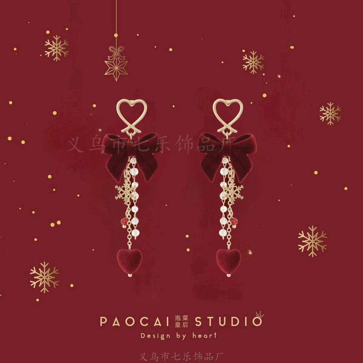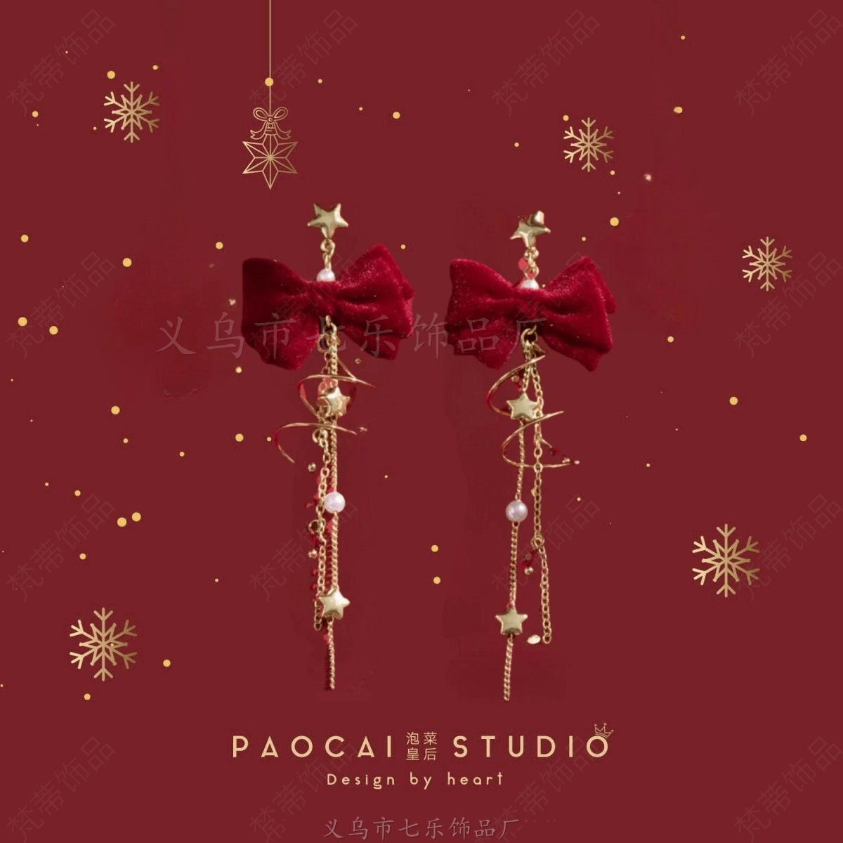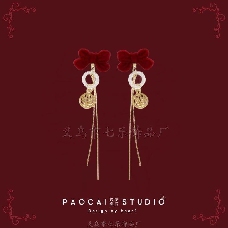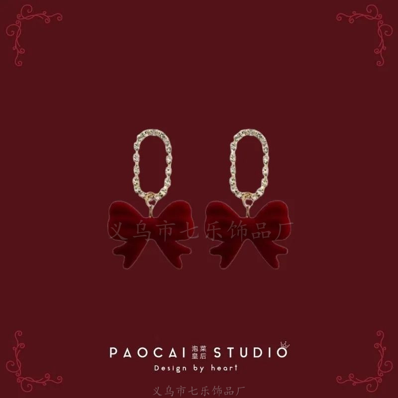 红色新年植绒蝴蝶结毛球耳钉小众高级感耳饰过年结婚小众高级耳环