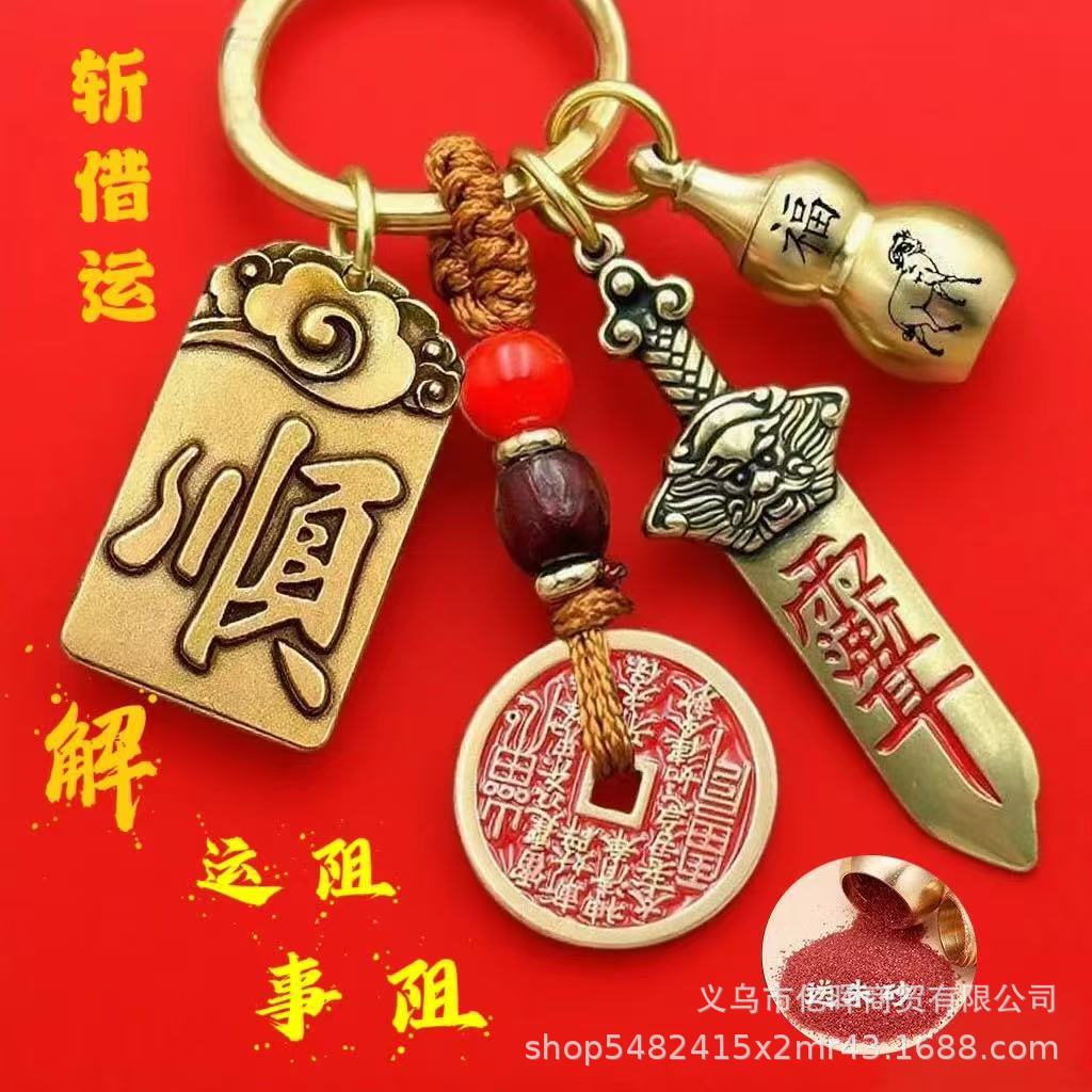 时来运转纯黄铜虎头招财令牌钥匙扣山鬼花钱真品七星宝剑汽车挂件