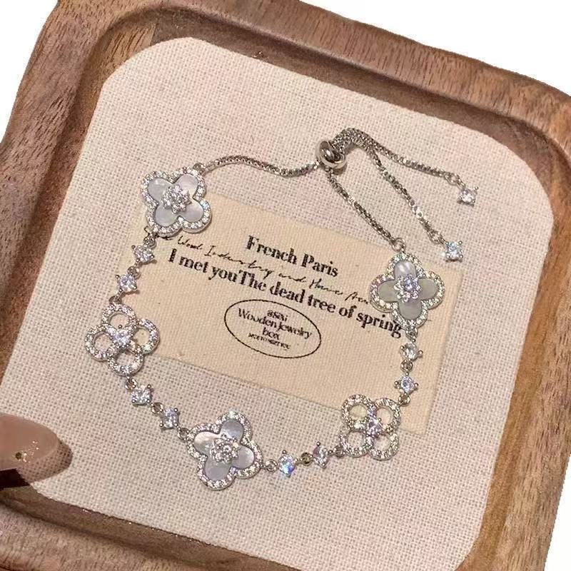 新款手链闪亮天然色贝母镂空幸运四叶草抽拉手饰女小众轻奢手饰品