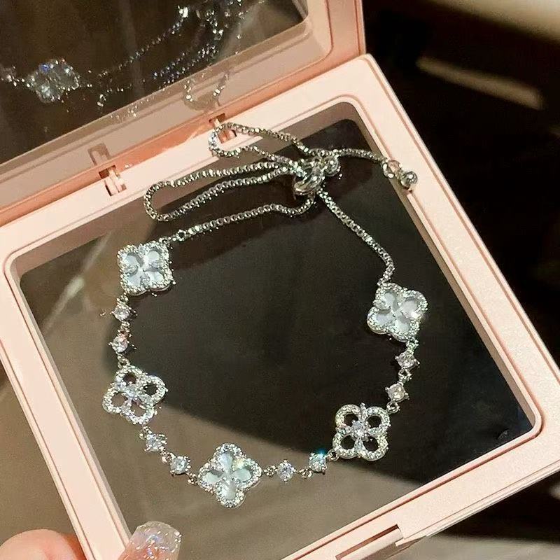 精致镶钻闪亮仿天然粉贝镂空幸运四叶草抽拉手链女小众轻奢手饰品