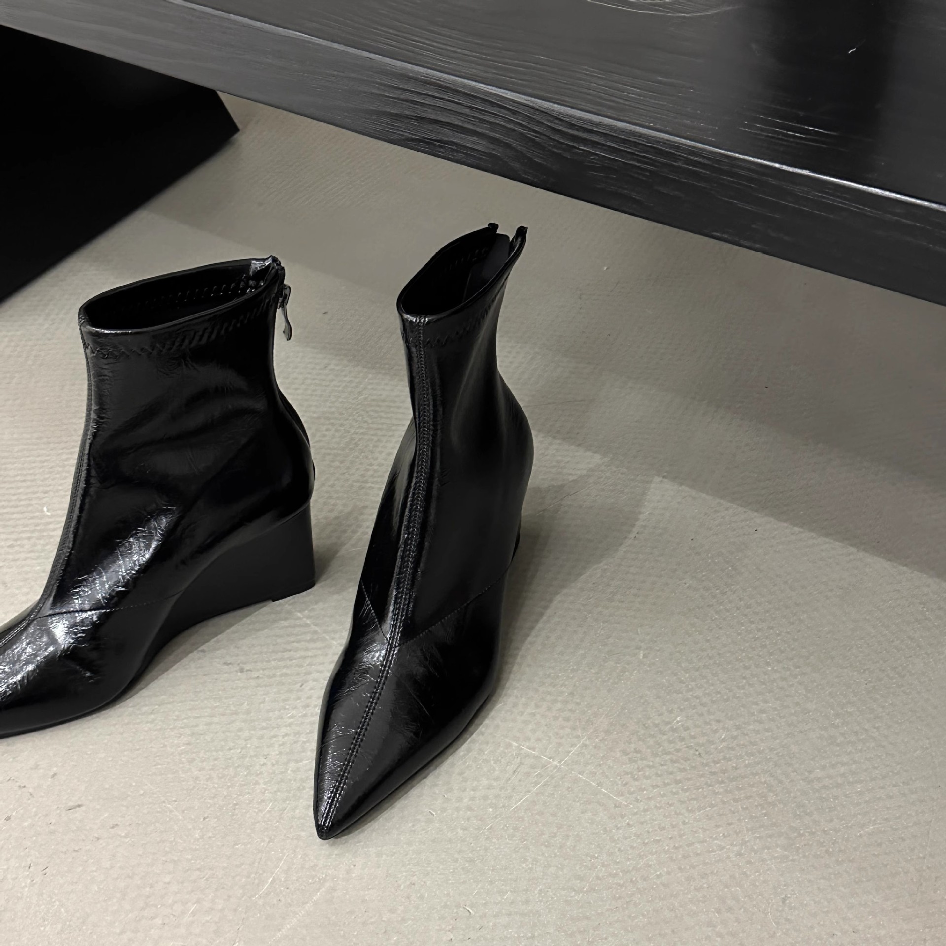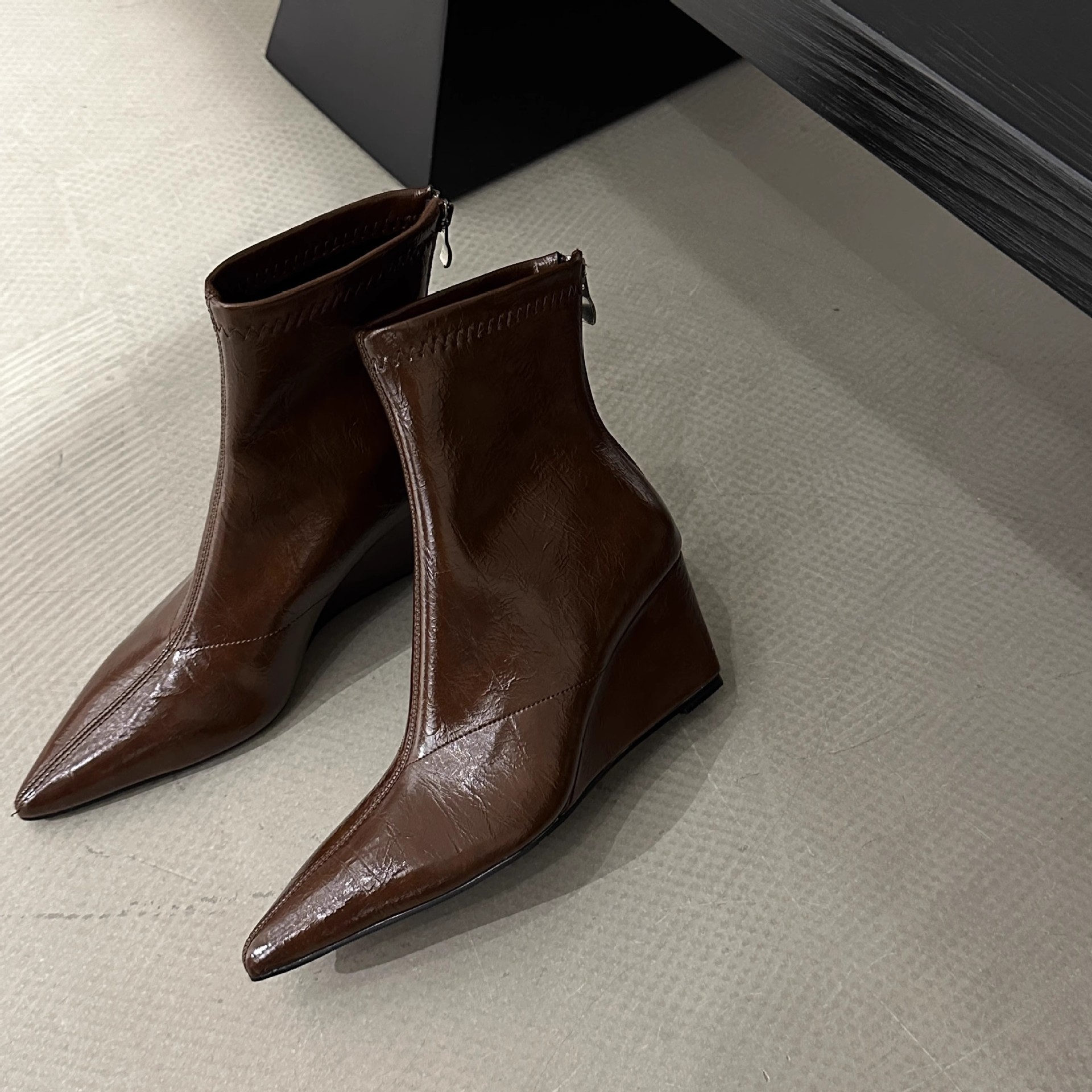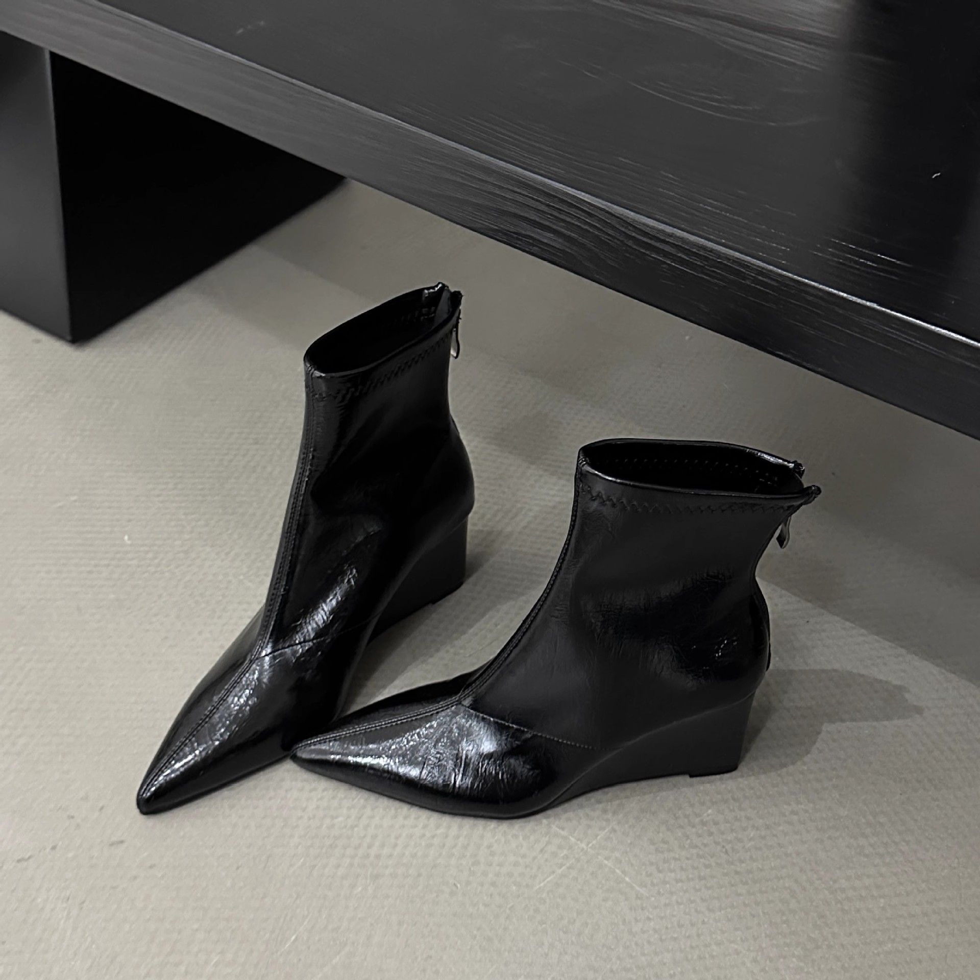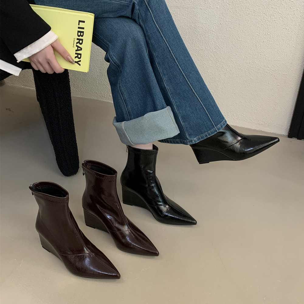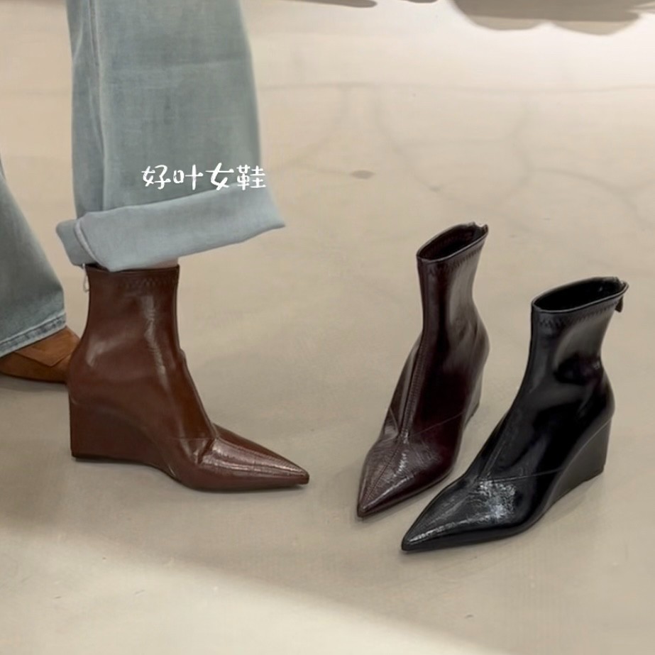 高级感尖头坡跟短靴女2025年秋冬新款后拉链瘦瘦靴高跟百搭马丁靴